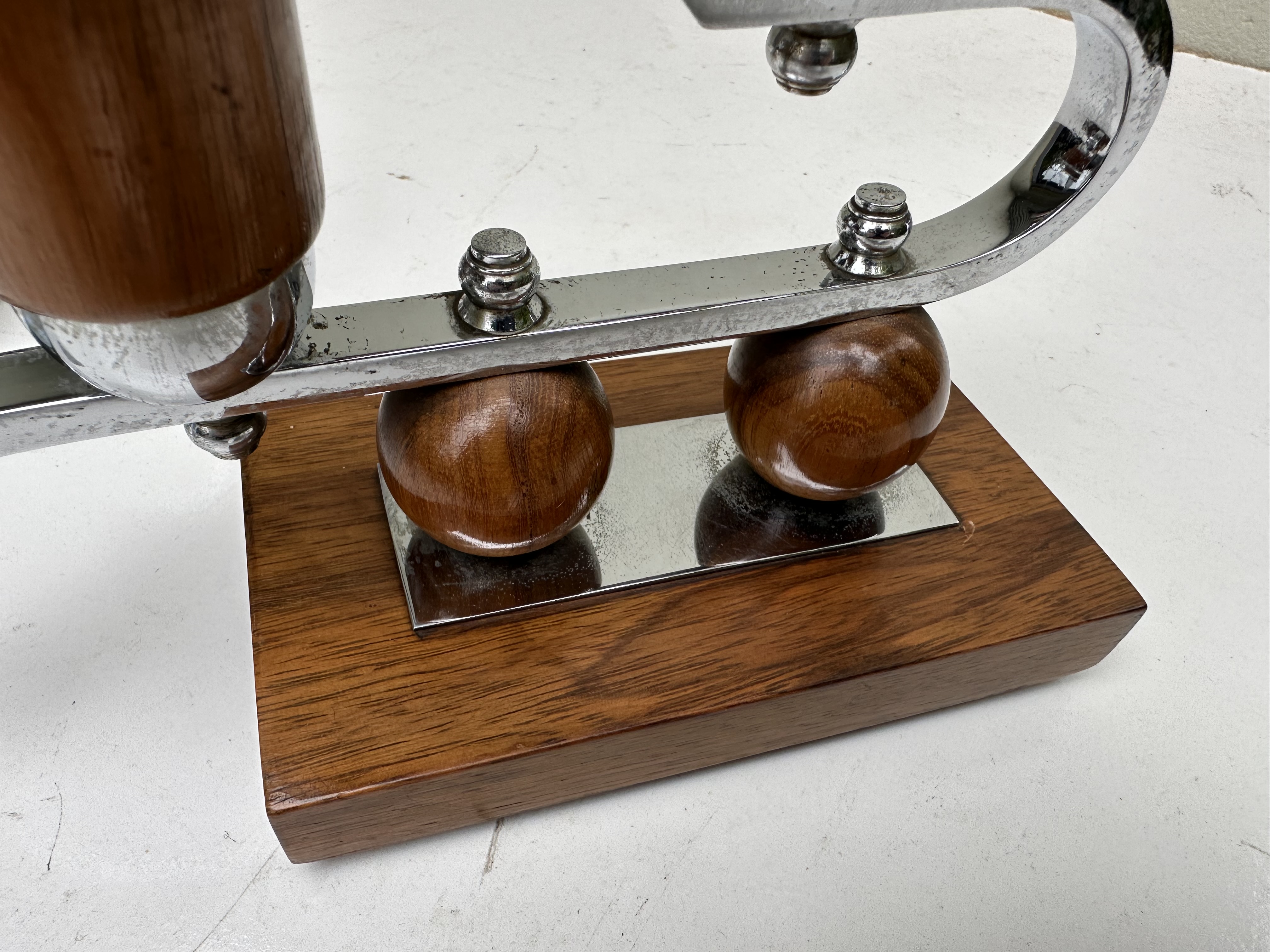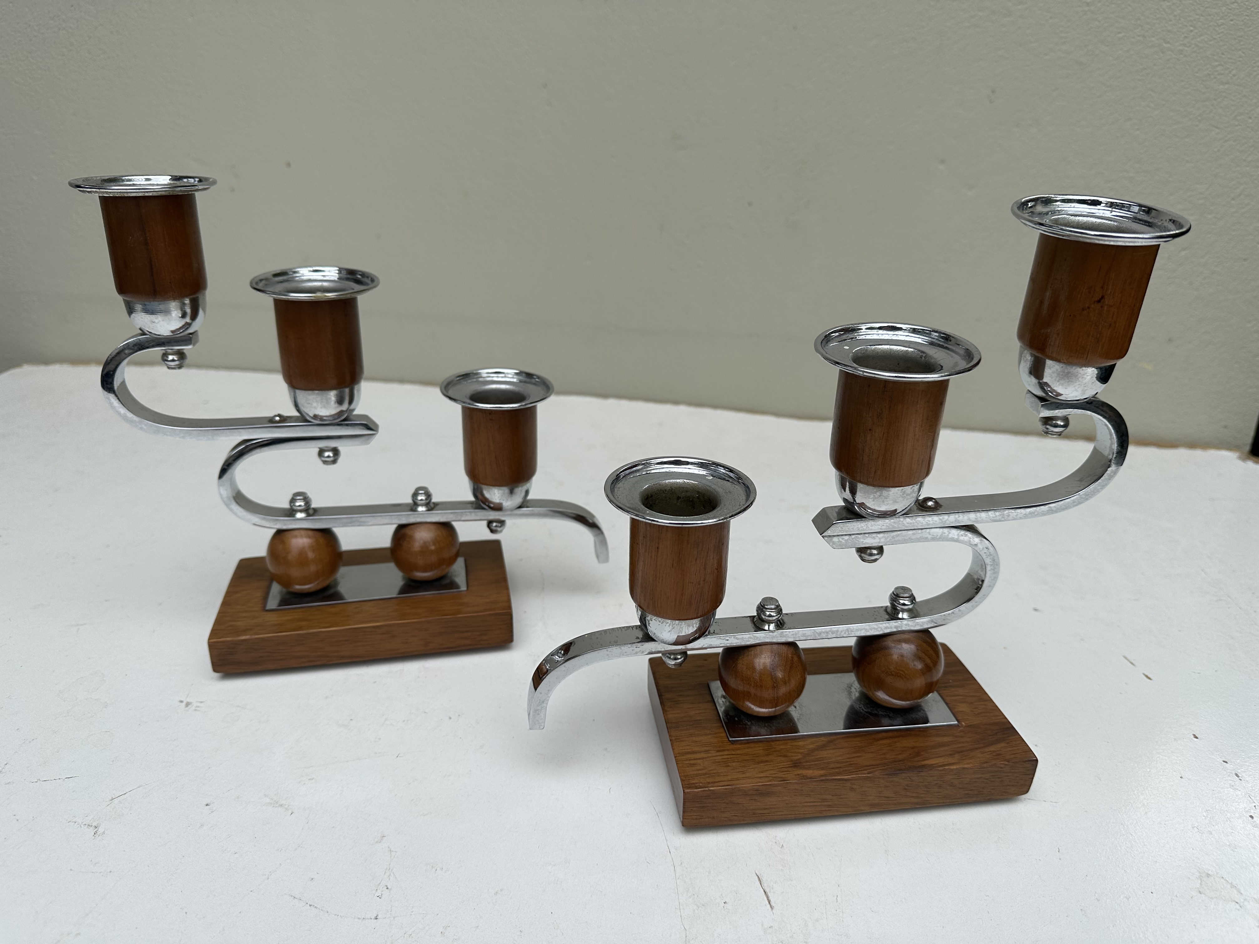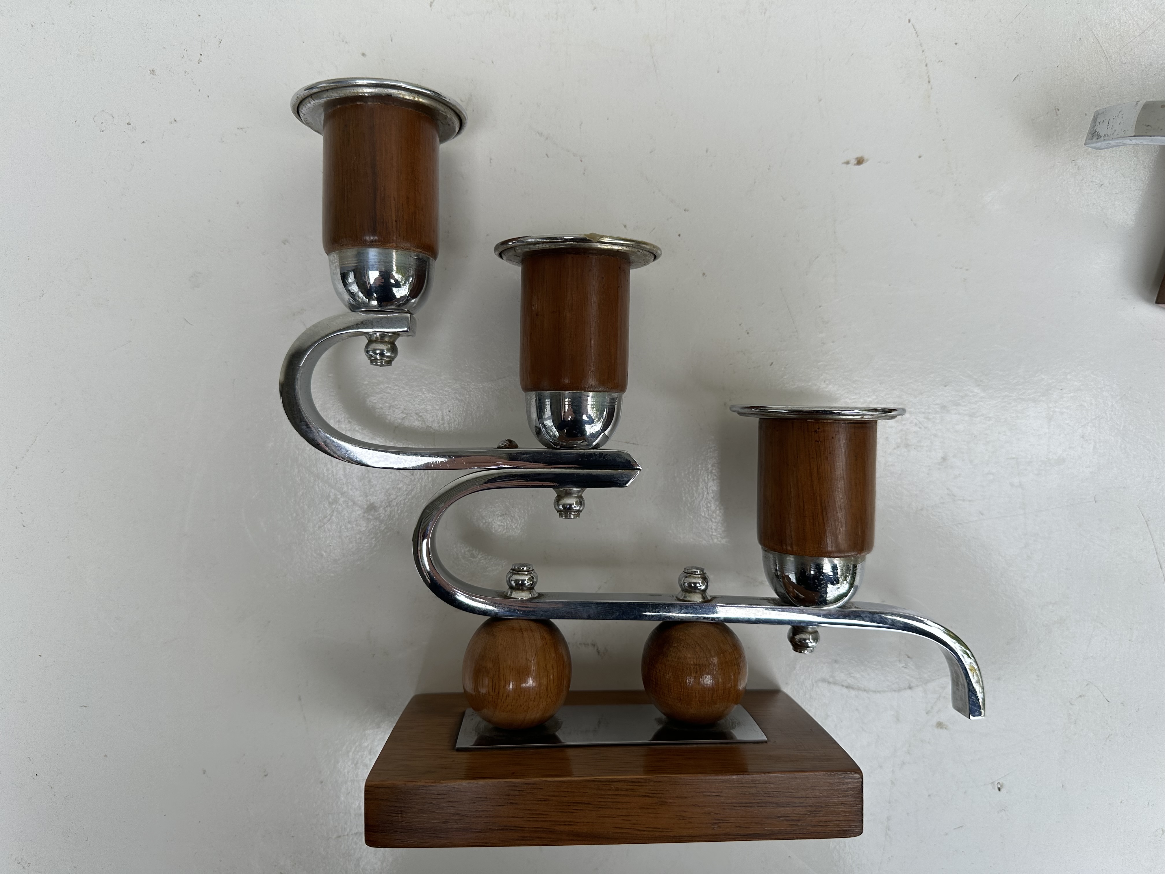 A pair of 1930's French Deco chrome and timber candlestick holders.