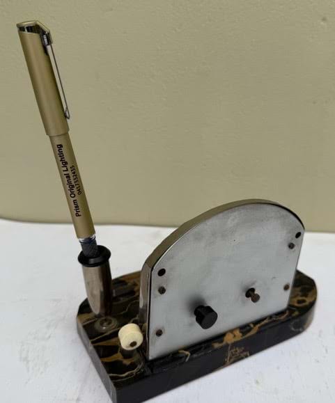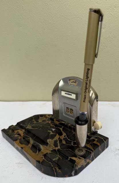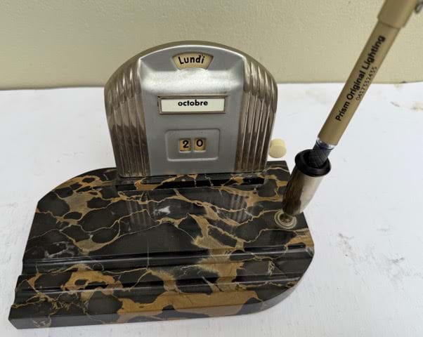 A beautifully made and designed 1930's French Deco Potoro marble base calendar desk set with mechanical adjustment of day and date, and manual adjustment of month.