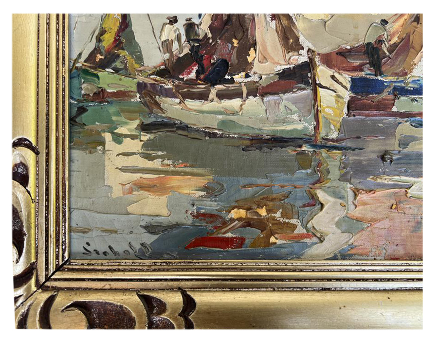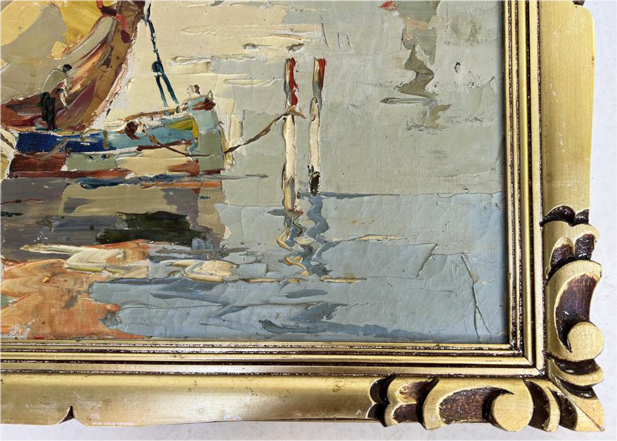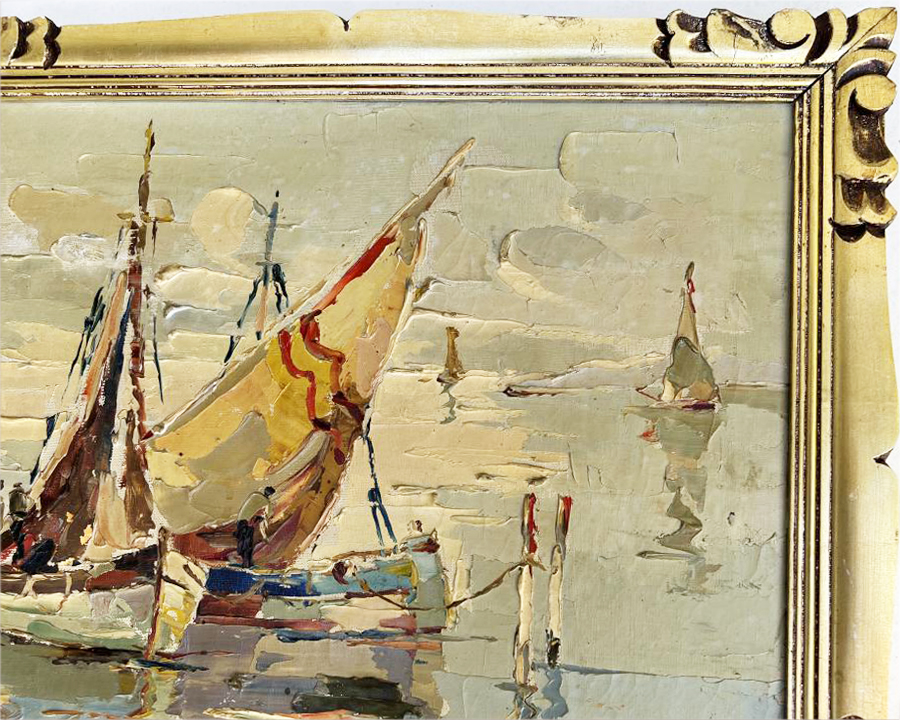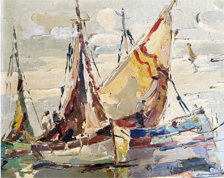 A lovely 1930's/40's French oil on canvas painting depicting (fishing?) sailing boats at anchor.