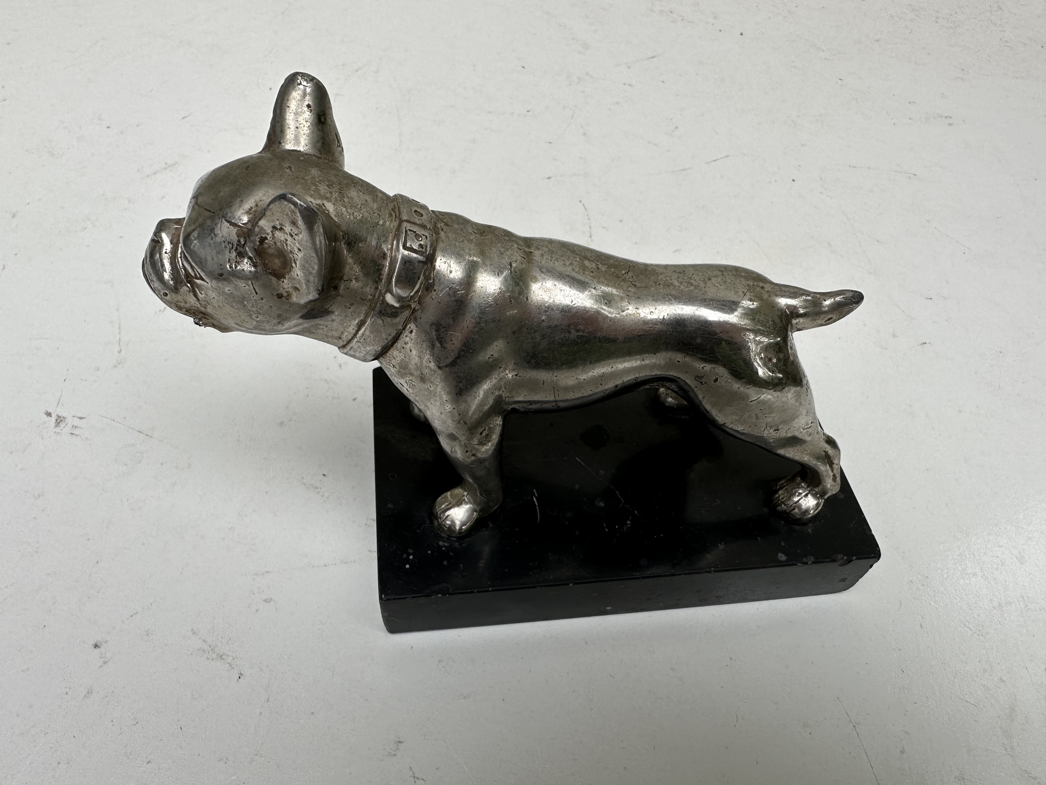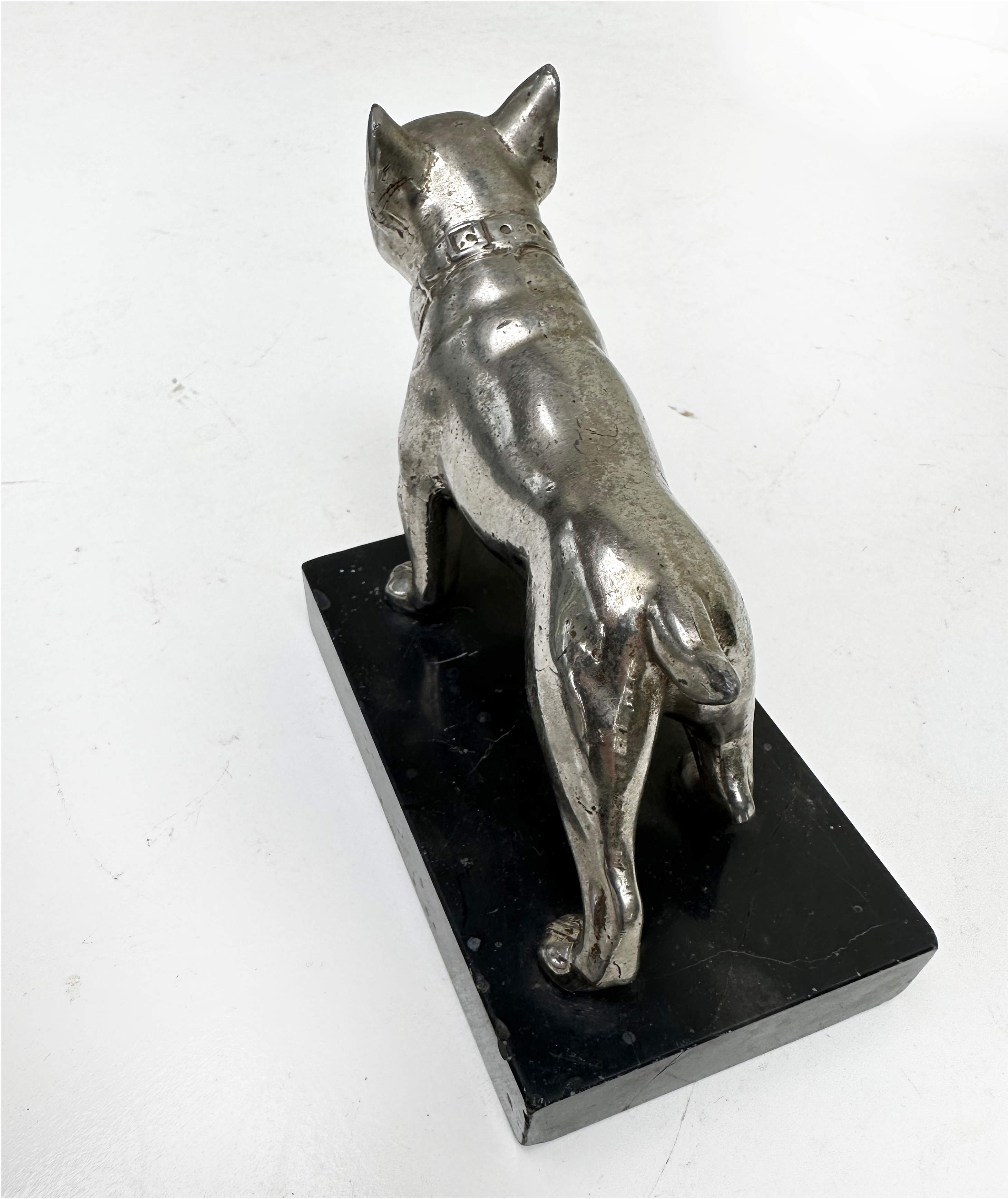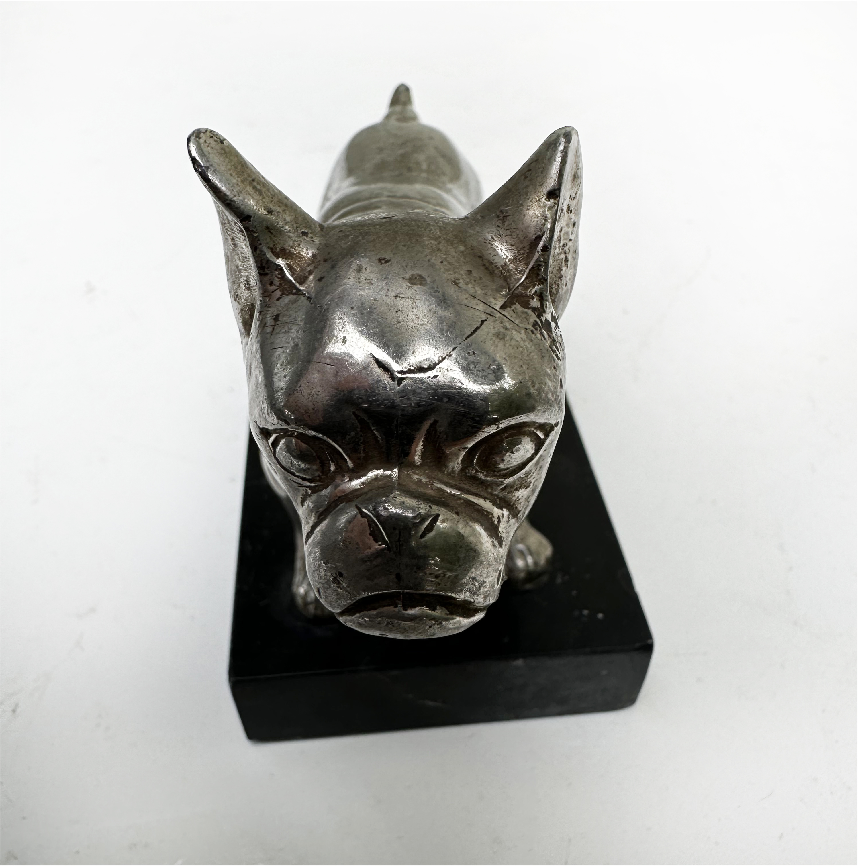 A 1930's French Deco silvered bronze bulldog sculpture/fob watch holder on a black marble base.