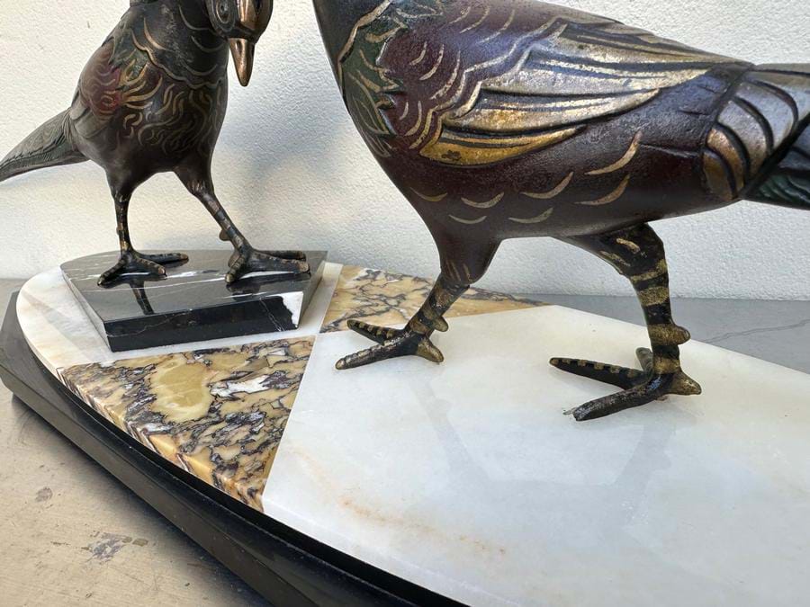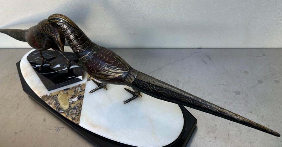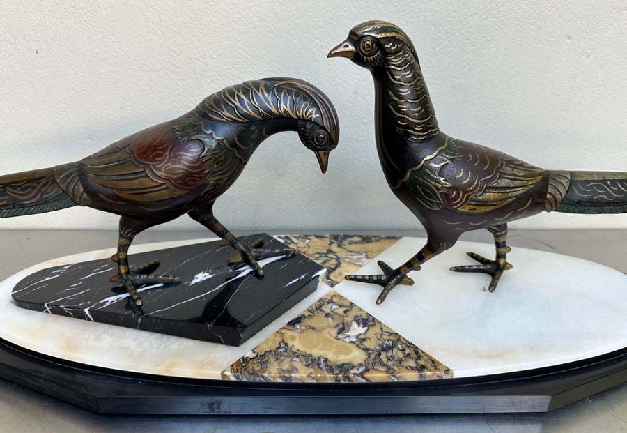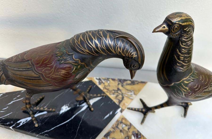 A beautiful large 1930's French Deco cast pheasant pair on a delightful marble base.
