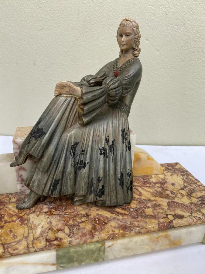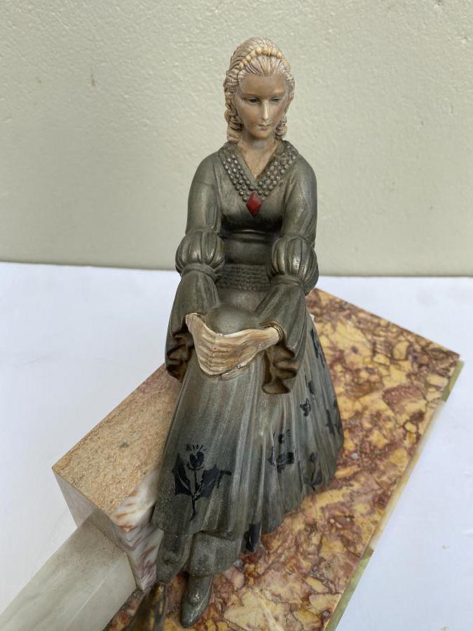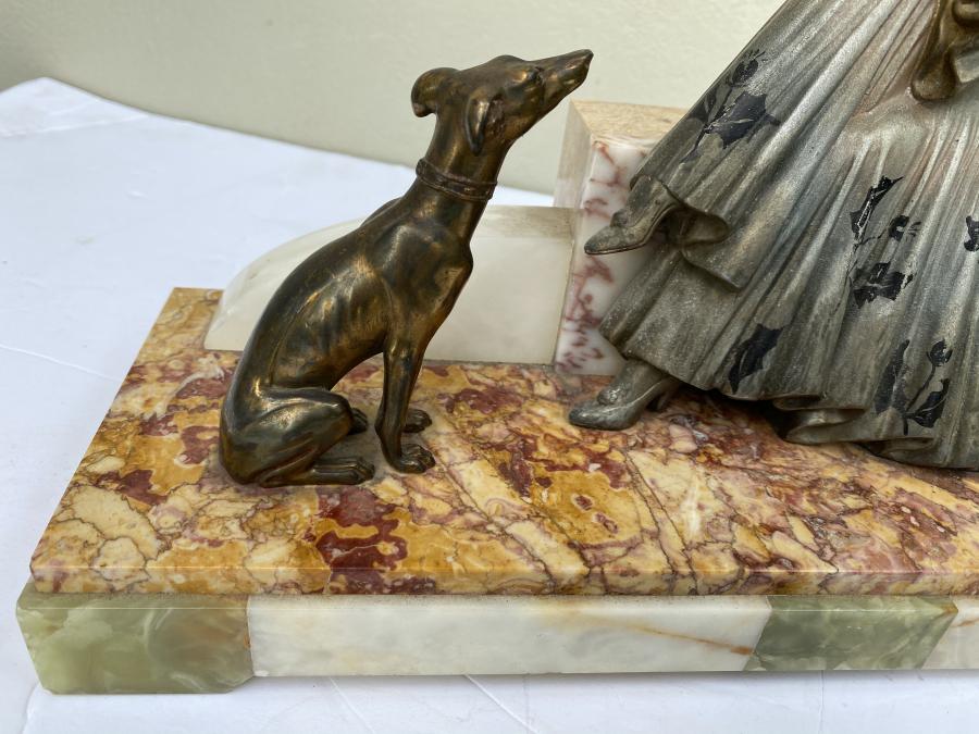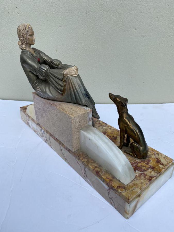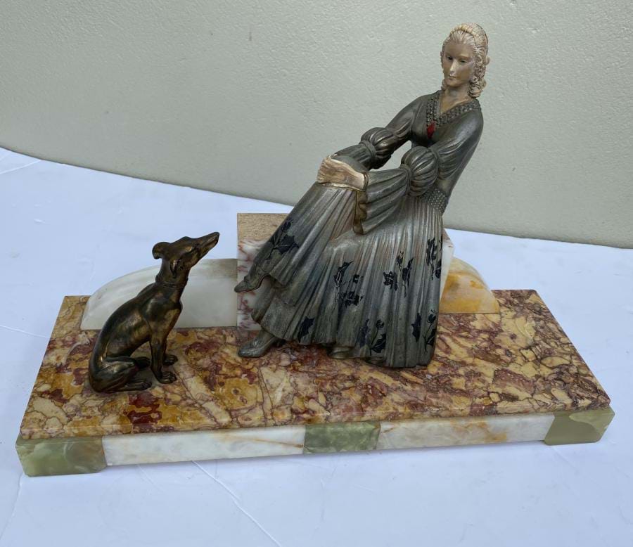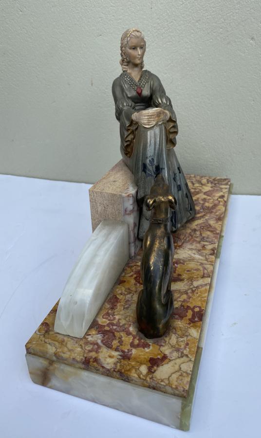 Delightful 1930's French Deco cast sculpture of a seated maiden with her greyhound on a marble and onyx base.