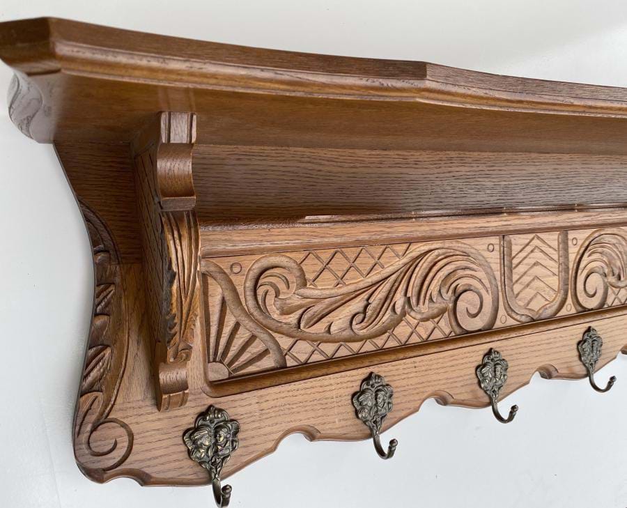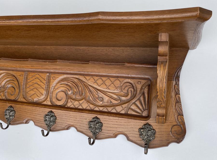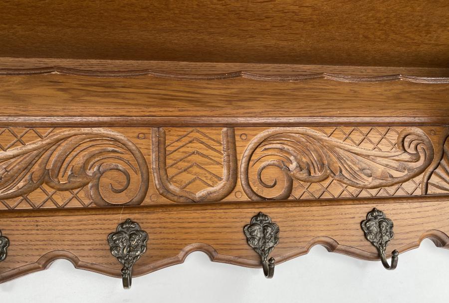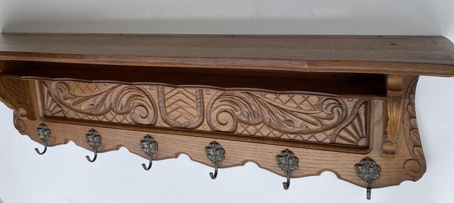 A very nice 1950's French solid oak wall mounted coat/hat rack with carved detail and a handy extra shelf for small things....like the car keys!
