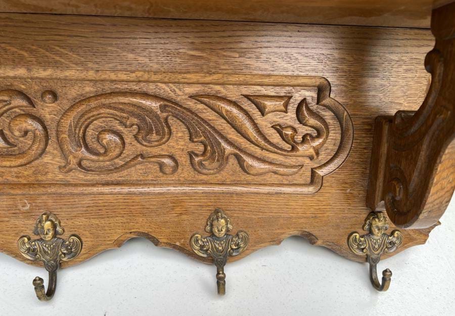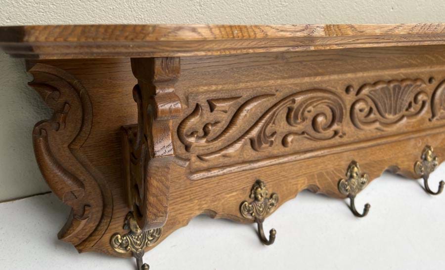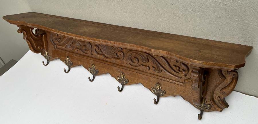 A very nice 1950's French solid oak wall coat/hat rack with carved details and (6) bronze hanging hooks.