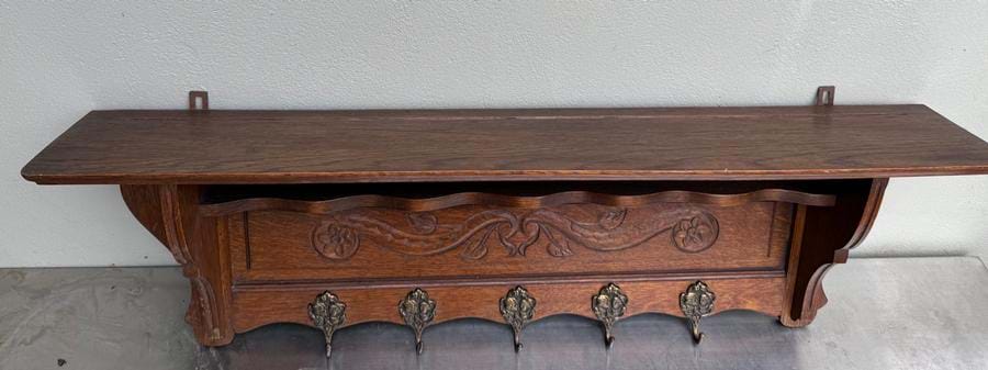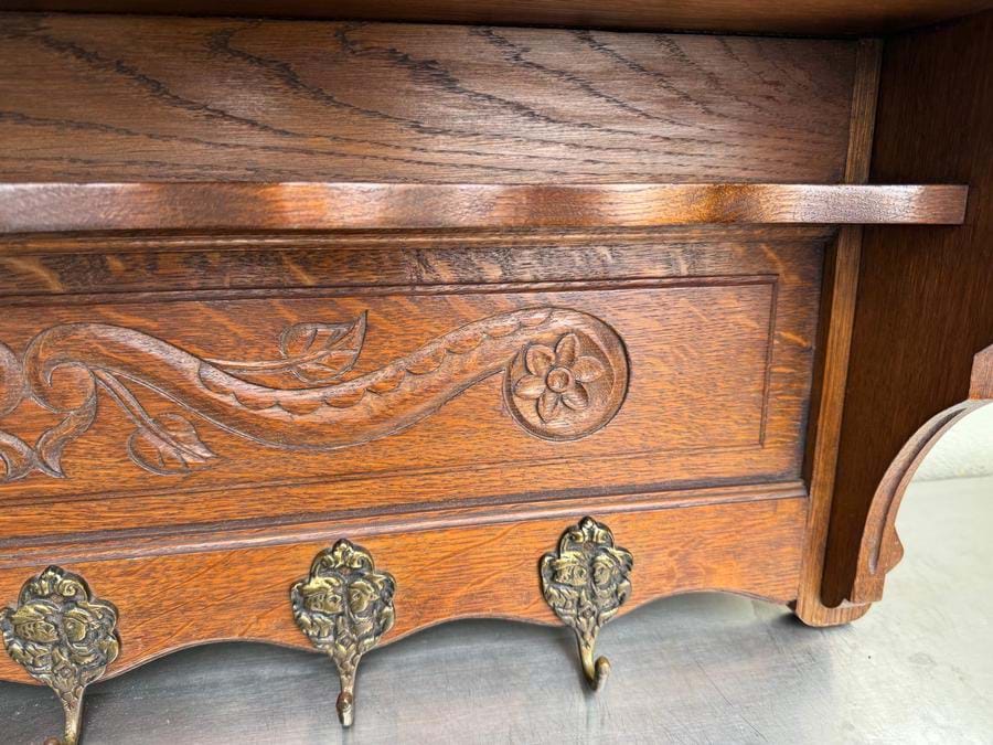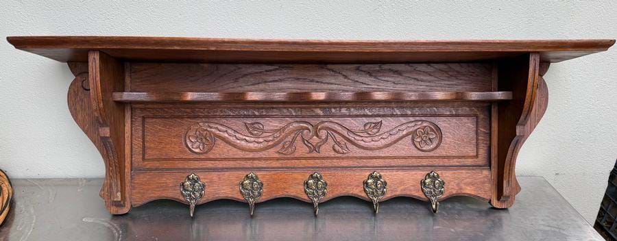 A useful and attractive 1940's/50's French solid carved oak wall mounted coat/hat rack with bronze hanging hooks.