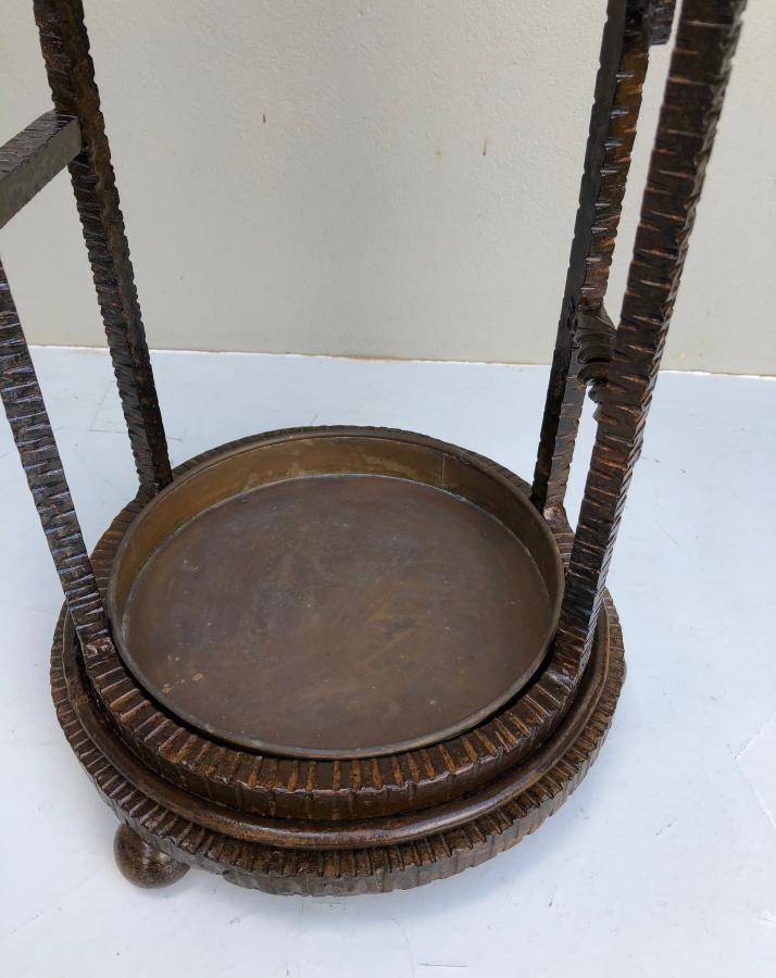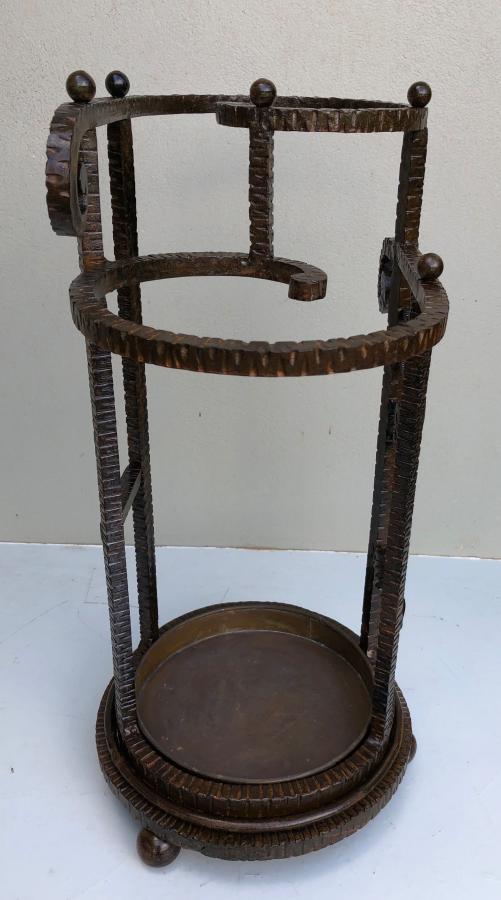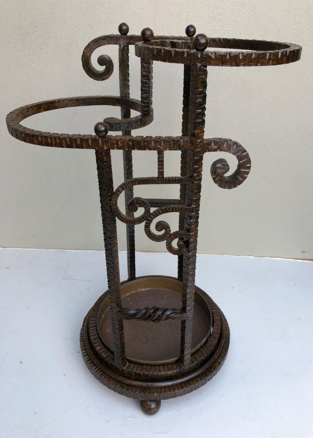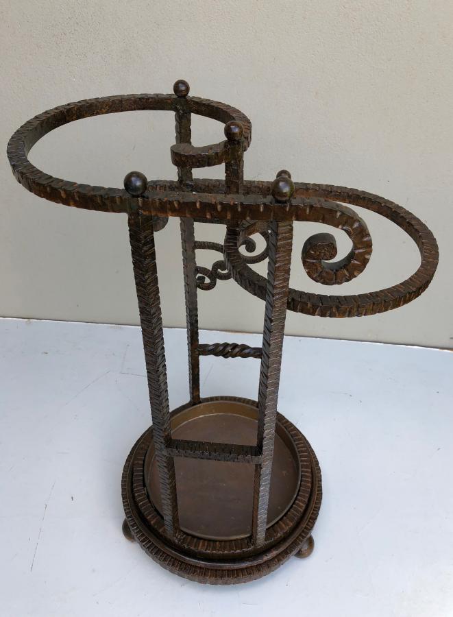 Superb 1930's French deco wrought iron umbrella/walking stick stand. Has its original brass pan insert and is in excellent condition. Great deco design! Very solid ....and weighty! Measures 610mm tall and is 420mm wide at top/320mm wide at base.