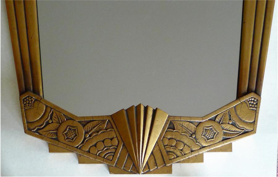 A fine large 1930's French Deco carved gilt mirror with bevilled edge and angled top.
