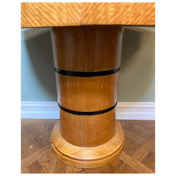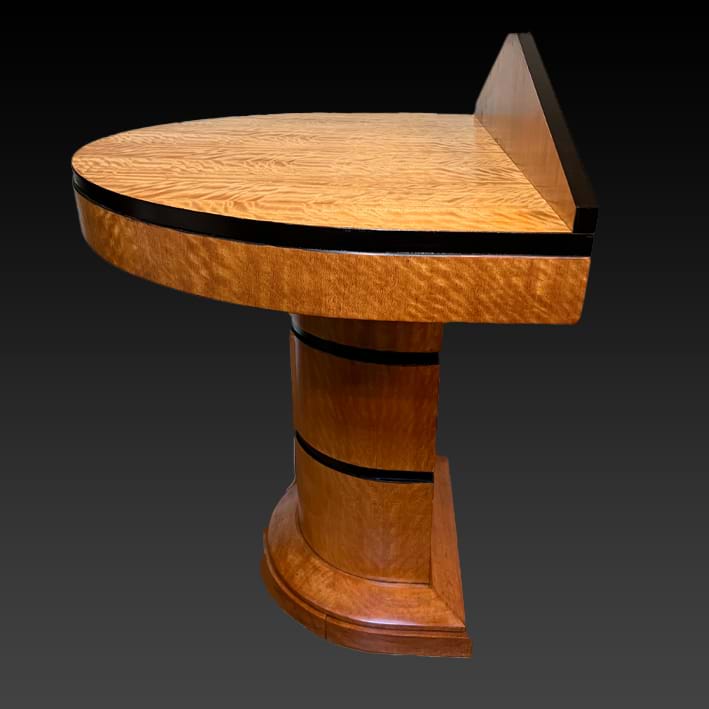 A great 1930's Australian Deco semi-circular figured Queensland maple hall/side table with black Japanned detailing.