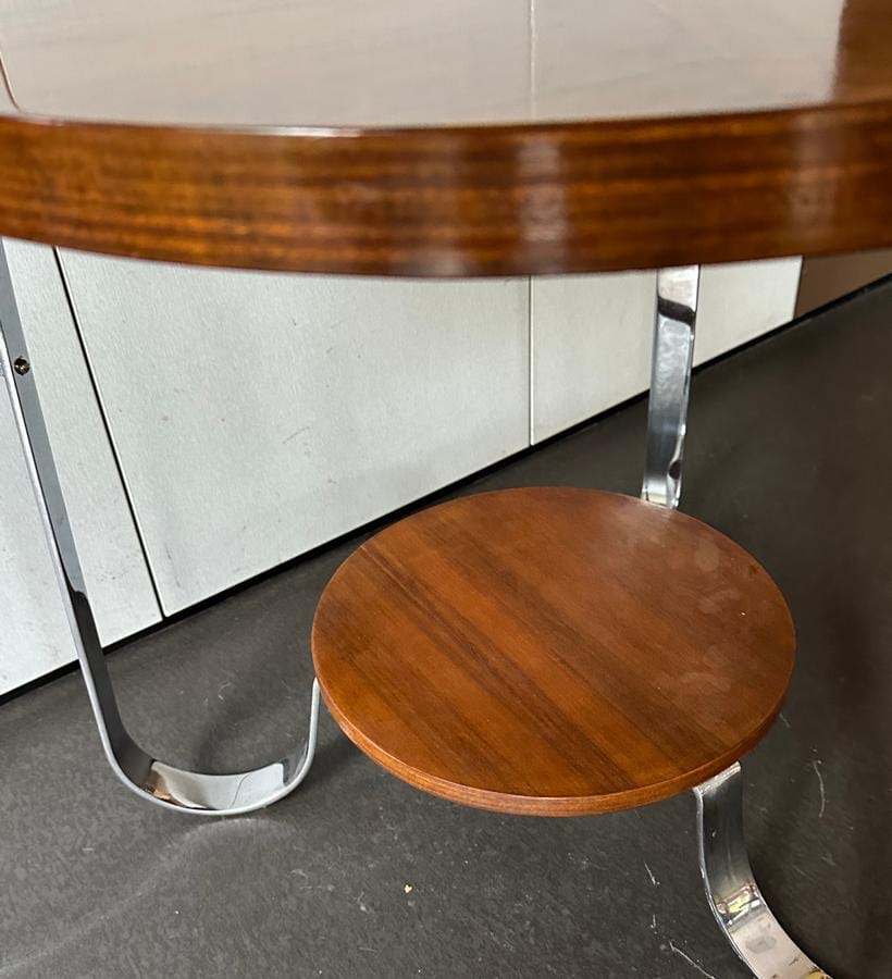 A very nice 1930's Deco 2 tiered occasional table with solid chromed curved legs and inlay Queensland black bean top and lower shelf.