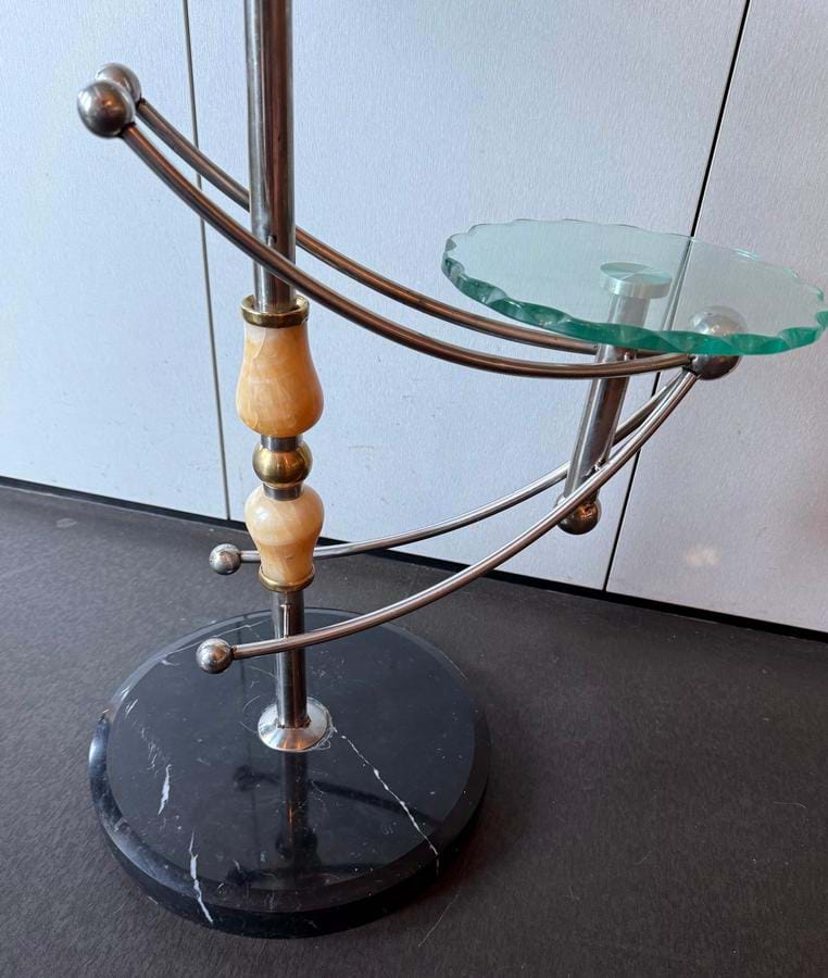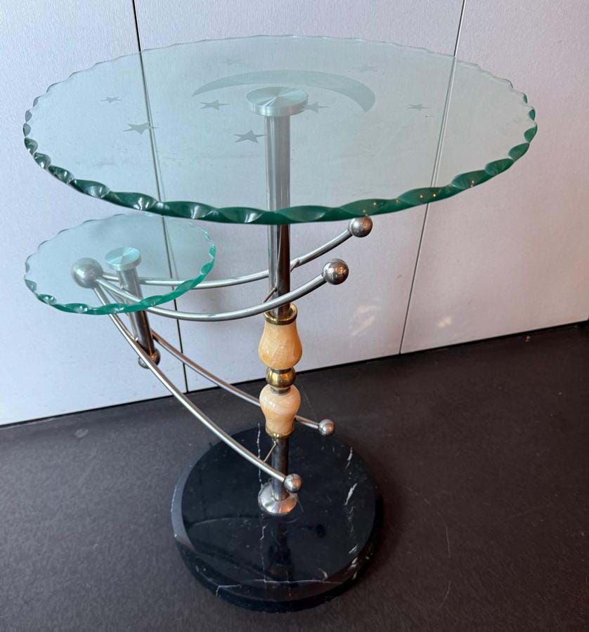 An unusual 1930's Italian (?) Deco chrome and black marble base 2 tier occasional table with glass shelves.