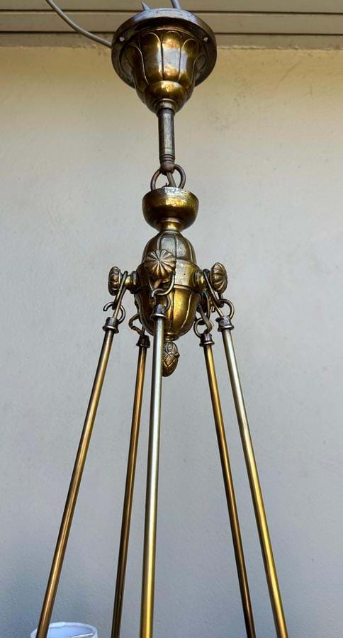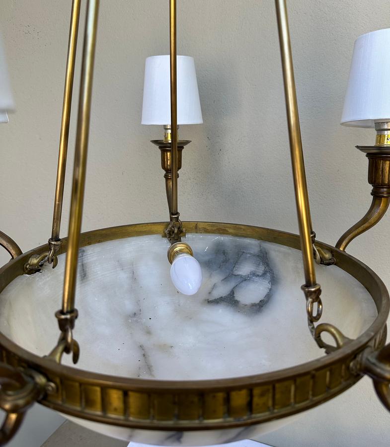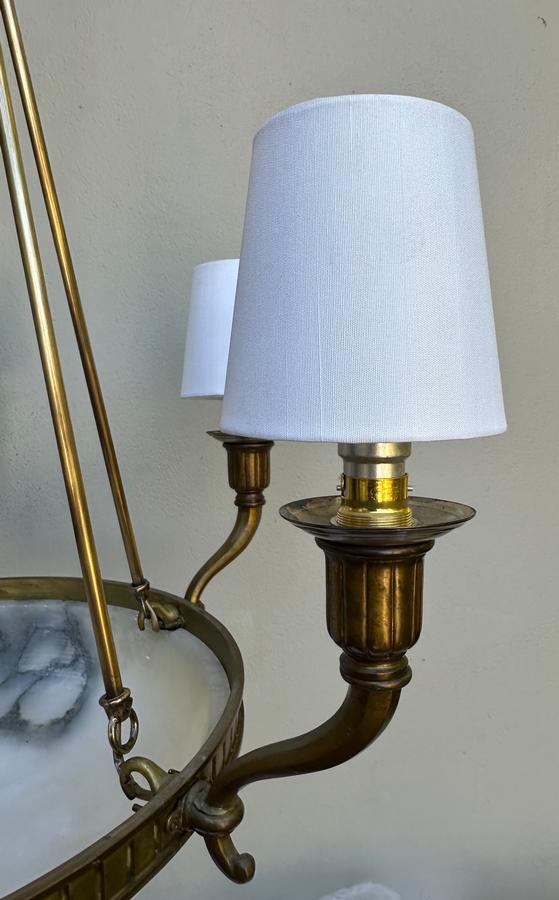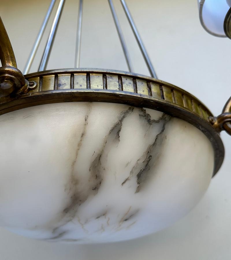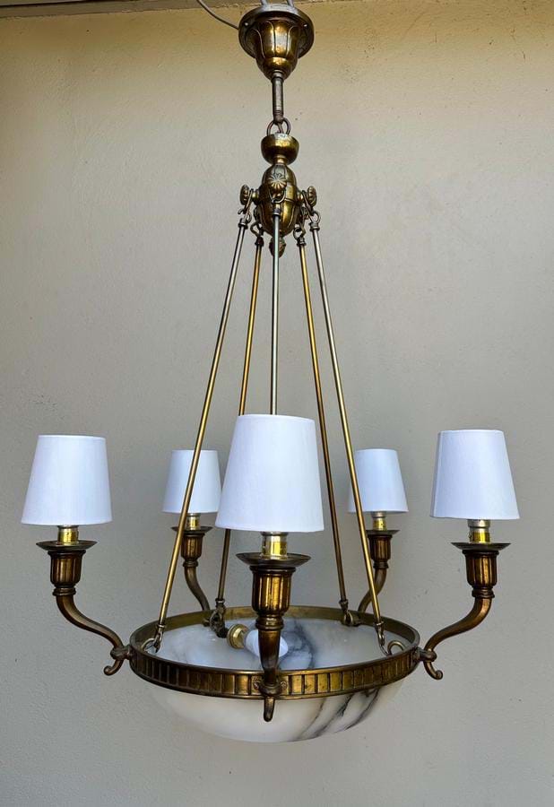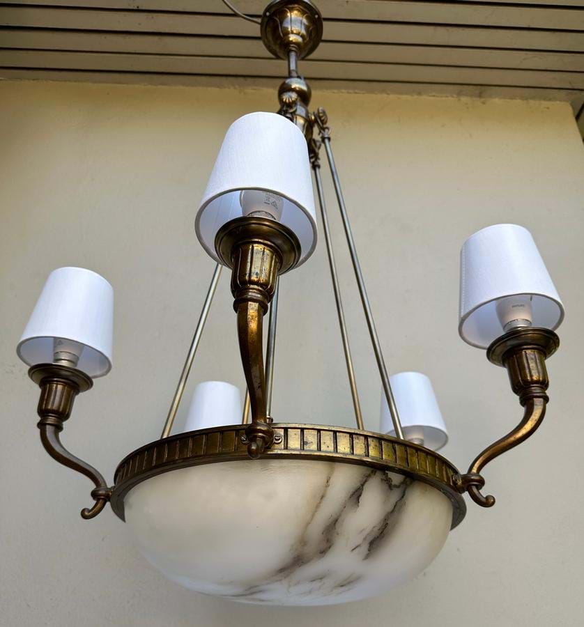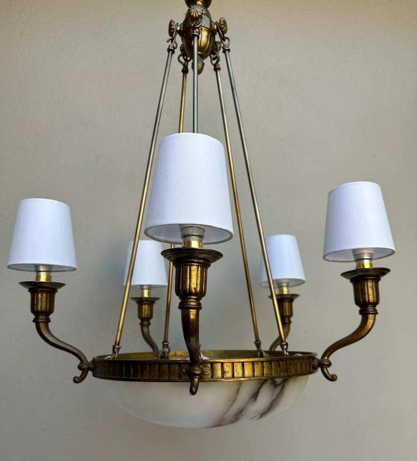A beautiful large 1930's French Deco solid bronze 6 light chandelier with central alabaster shade and 5 surrounding quality white linen shades on the solid cast arms.