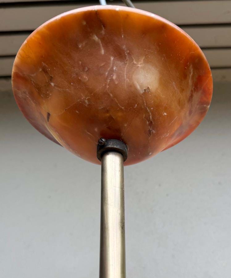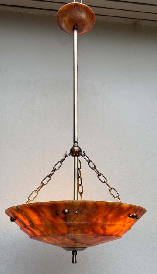Shade has lovely colours and veining and comes with re-wired aged brass/bronze suspension fittings.