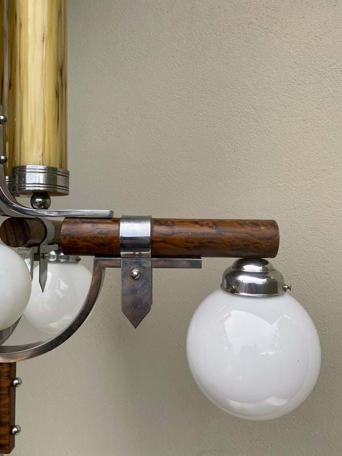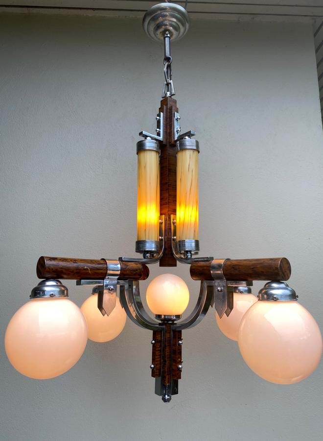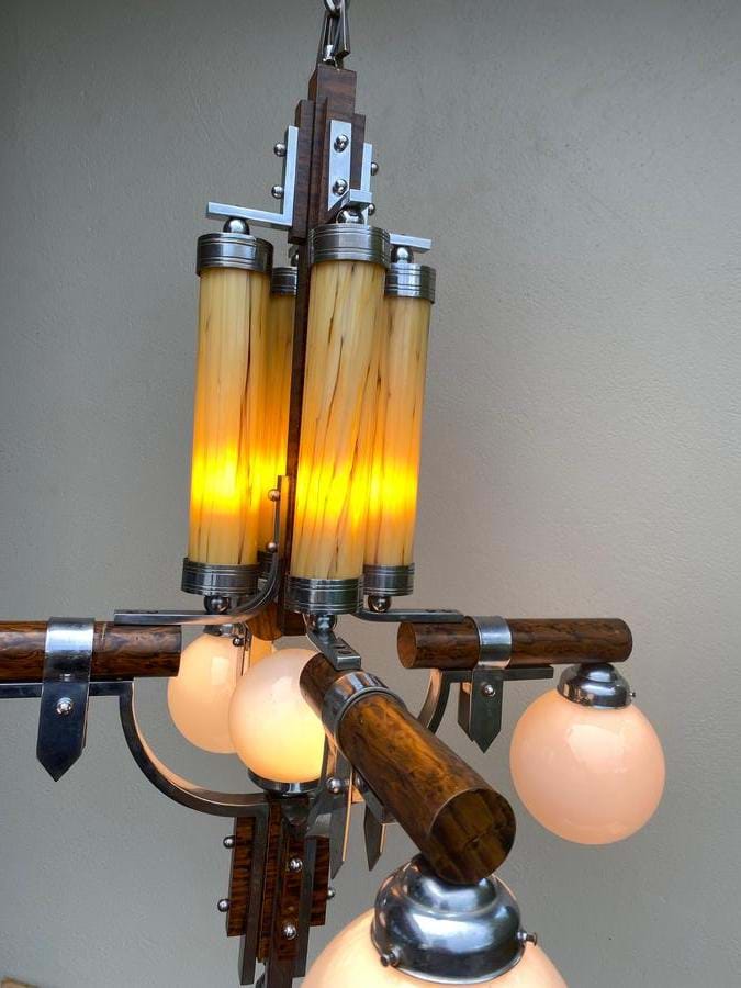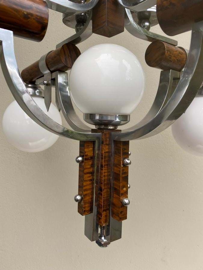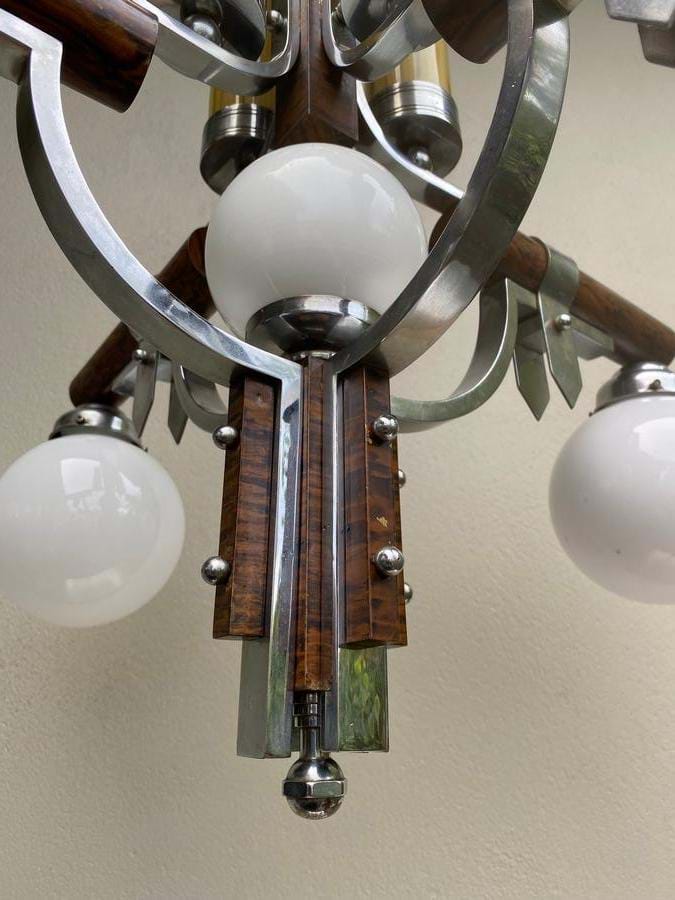 An exceptional large 1930's French Deco brass 9 light deco/modernist chandelier with combined chrome and faux timber finish.