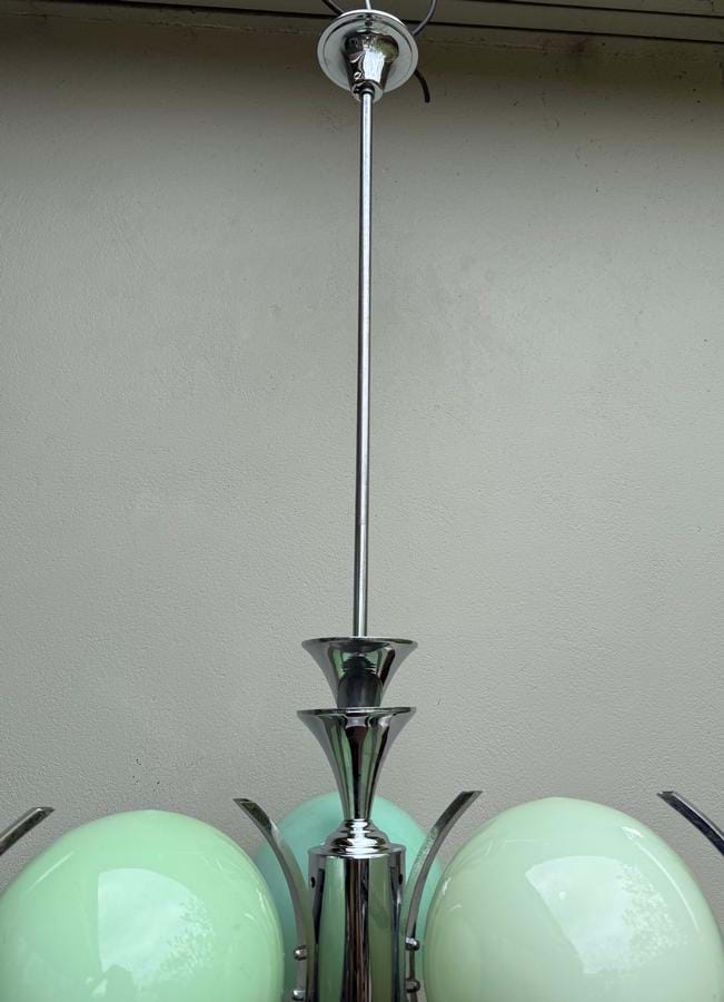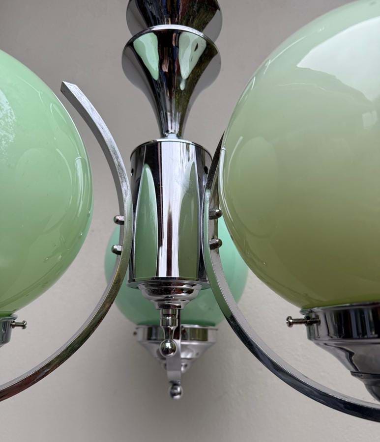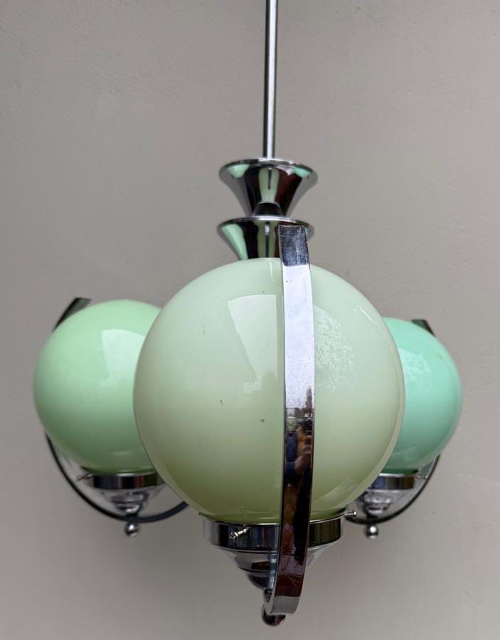 A very impressive large 1930's French Deco/Modernist chromed brass 3 light chandelier with original green cased spherical glass shades.