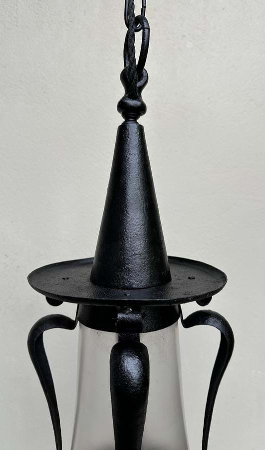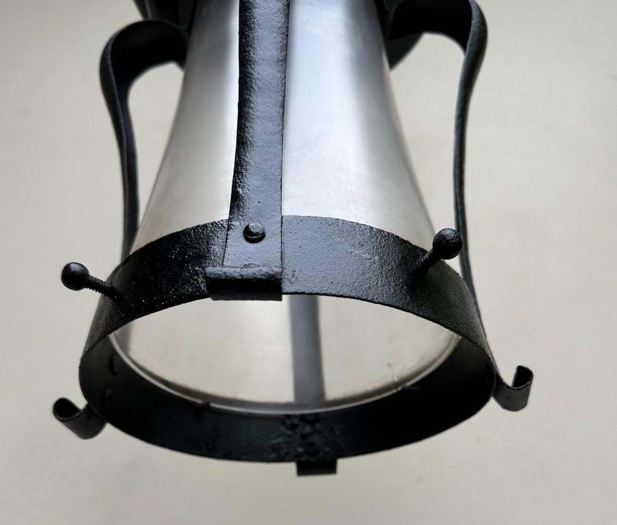 An unusual 1930's French Nouveau/Deco black iron porch/hallway lantern with its original flared frosted glass shade.