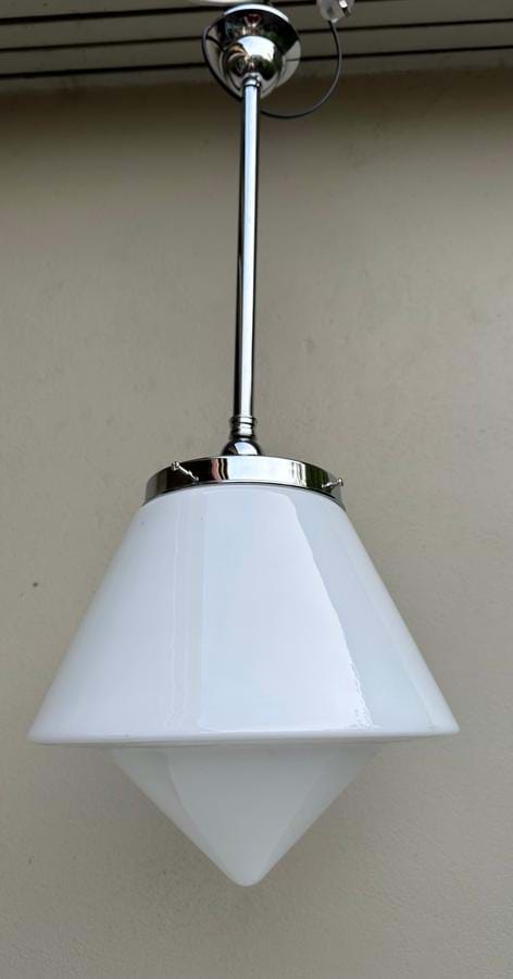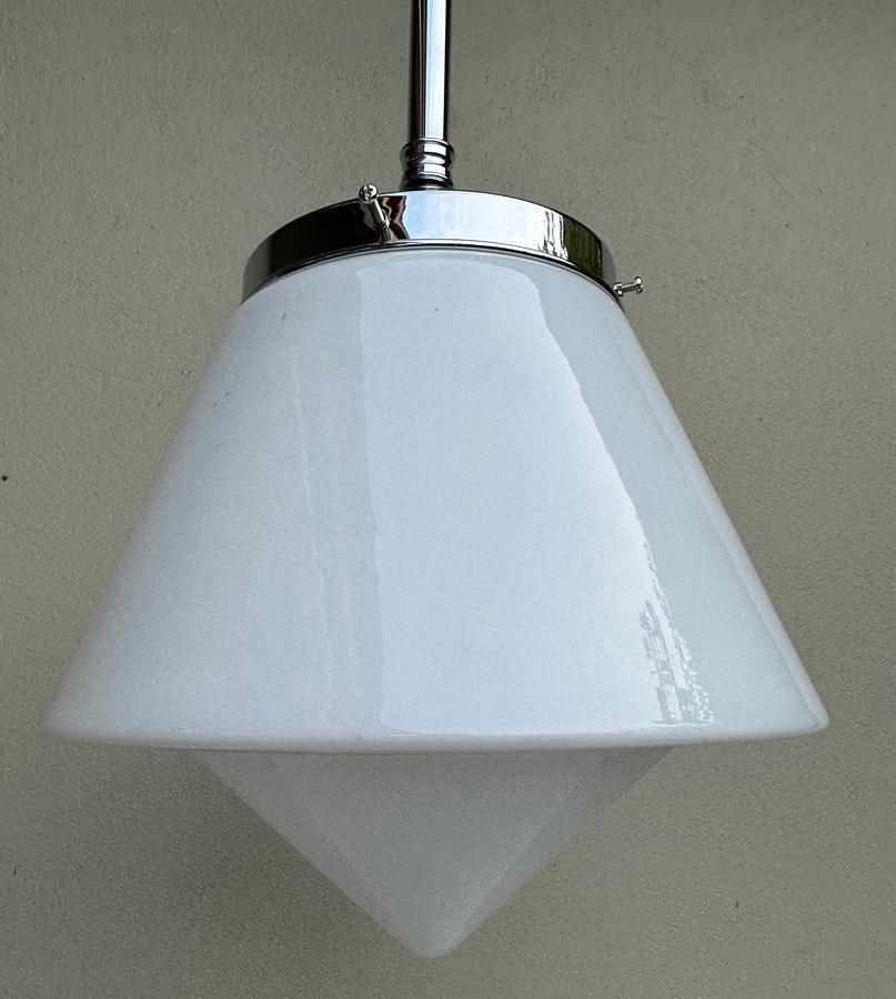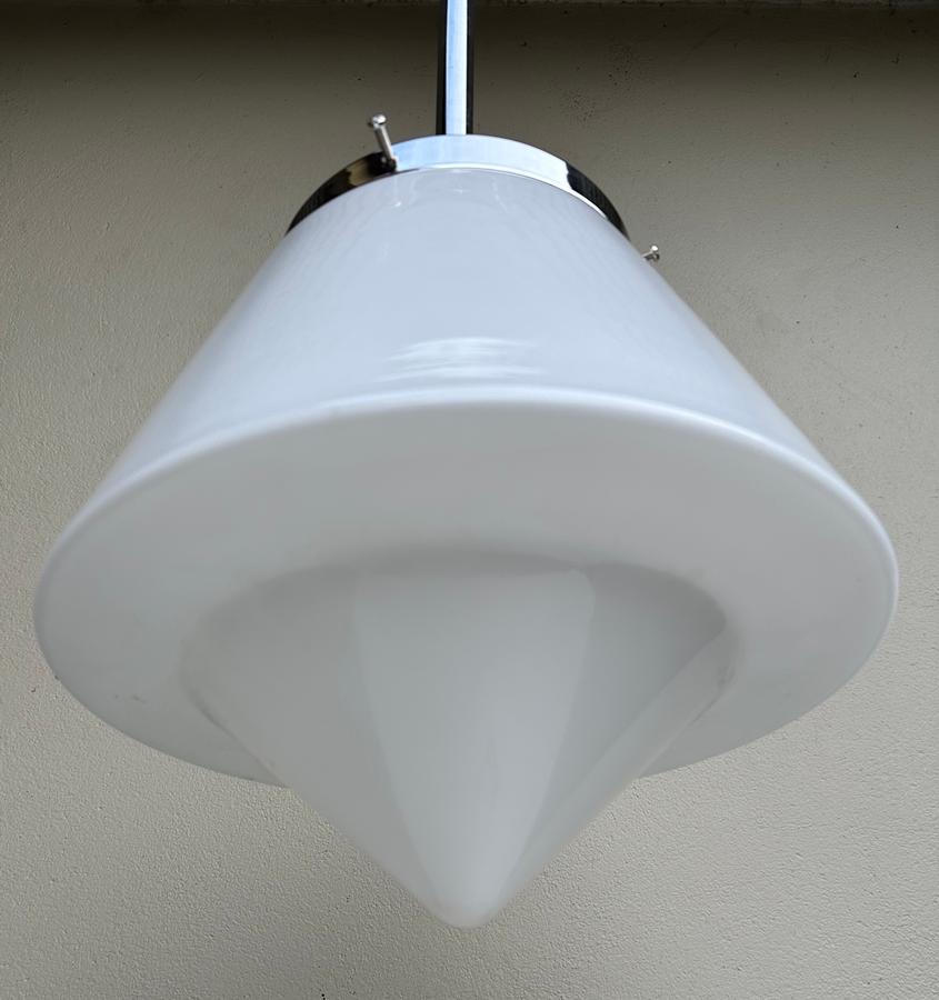 A large 1930's white glass stepped 'cone' shade with chrome rod suspension.