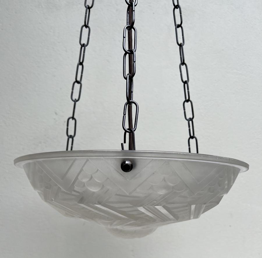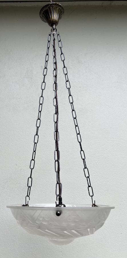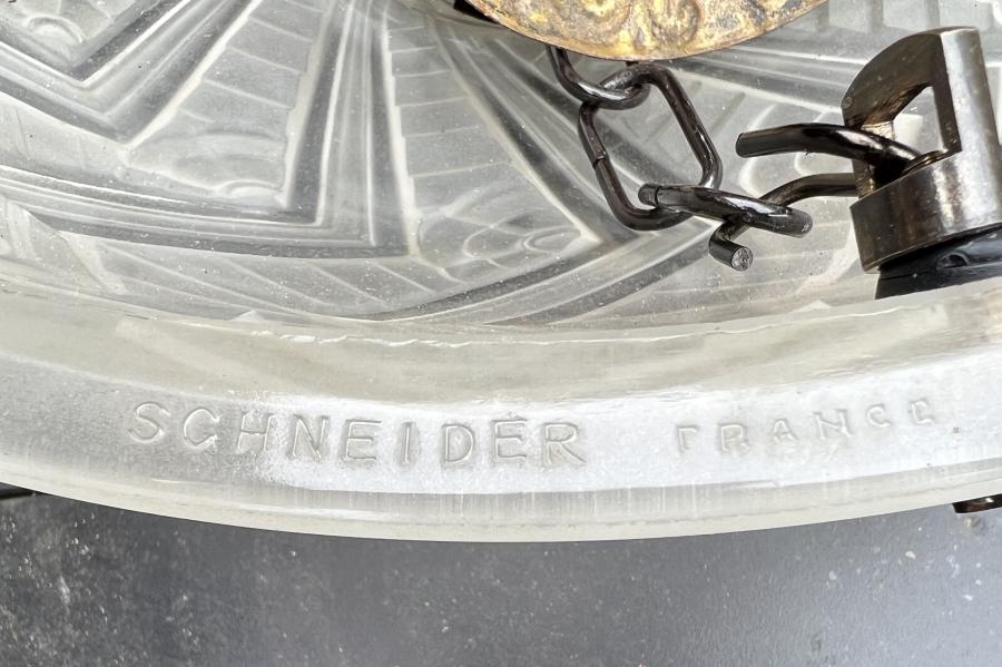 A superb large 1930's French Deco moulded clear/frosted glass ceiling light shade made by Schneider (marked on rim).