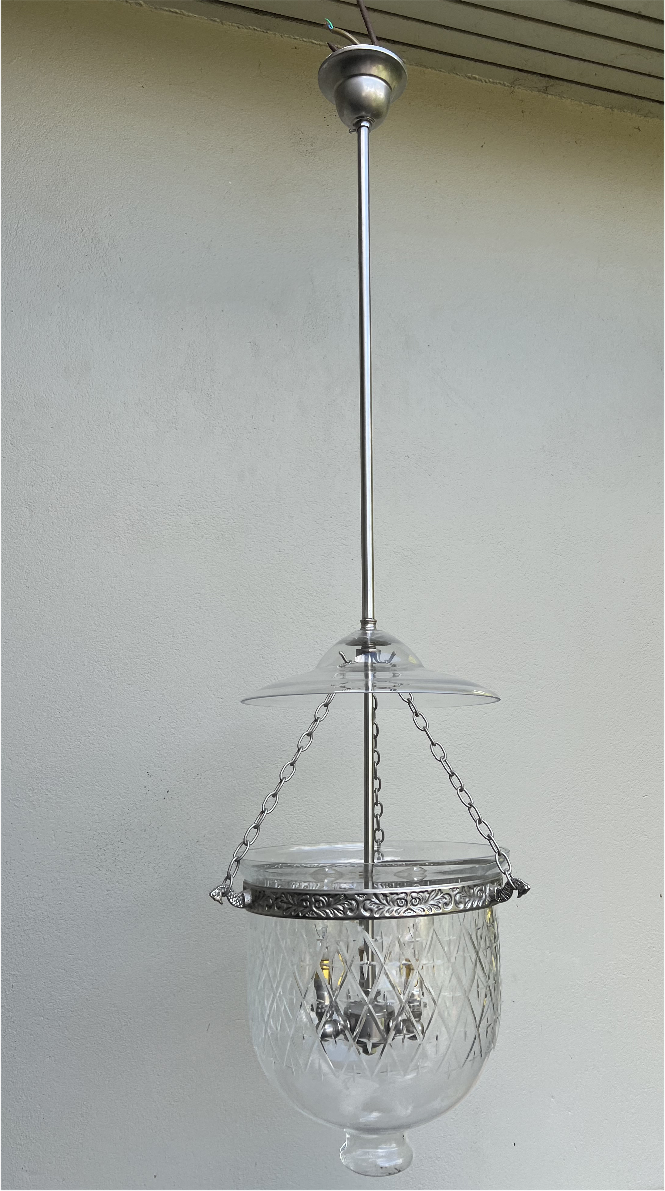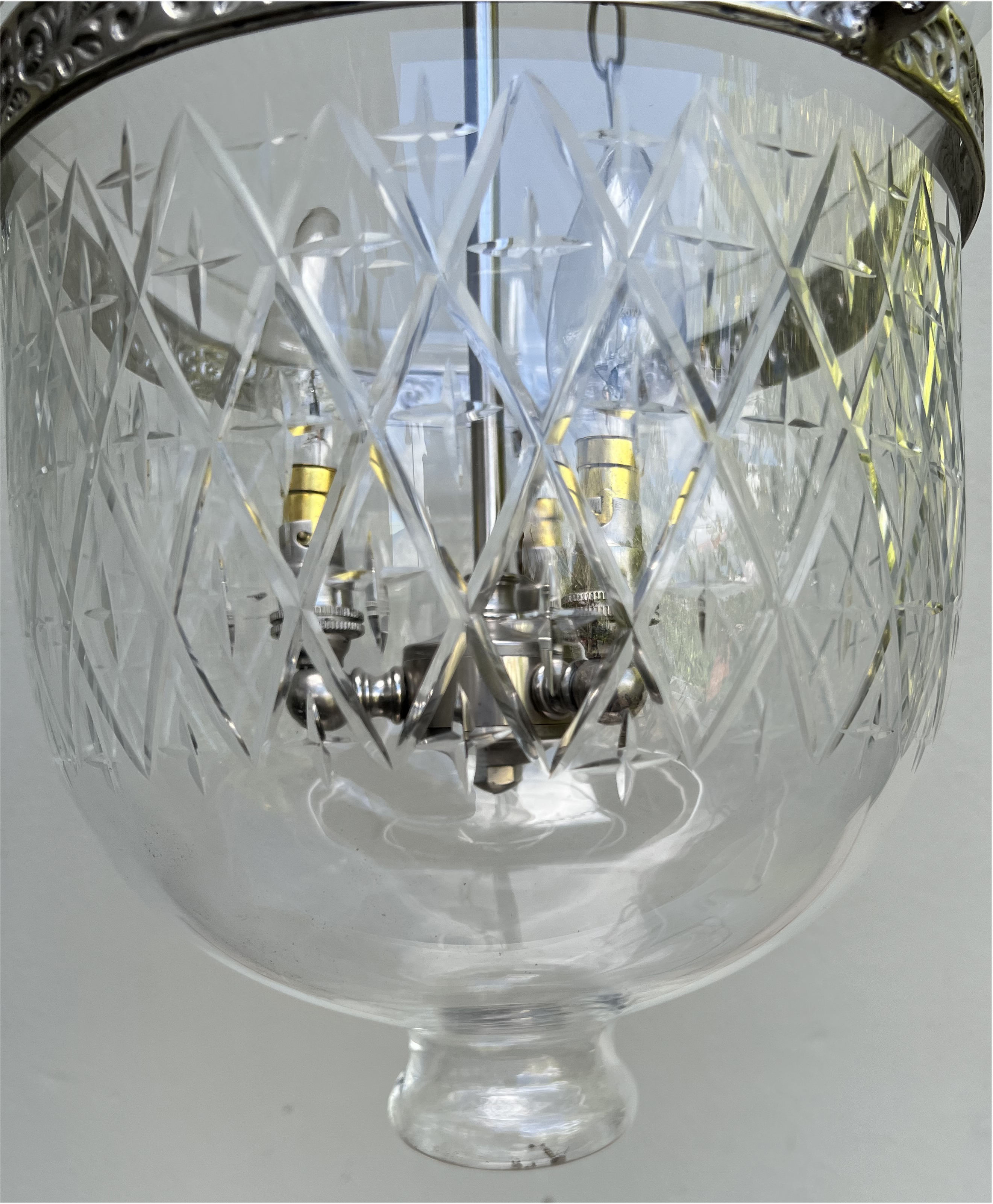 A beautiful pair of pair of French diamond pattern etched glass Float Lights with re-wired nickel plated brass fittings.