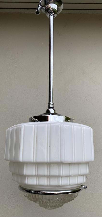 A set of matching large 1930's Deco moulded angular white glass ceiling light shades with clear prismatic glass bases.