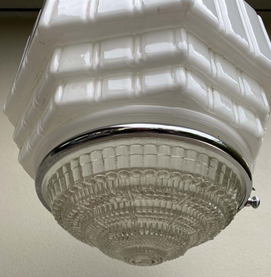 Large 1930's Deco moulded angular white glass ceiling light shades with clear prismatic glass base.