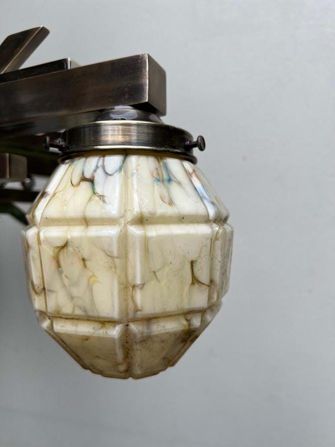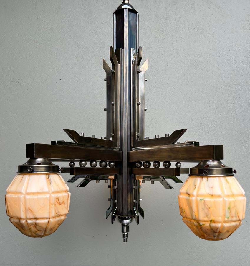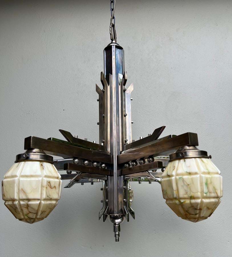 An exceptional large 1930's French (maybe German) brass/chrome 5 light chandelier with original moulded cream/yellow brown veined glass shades.