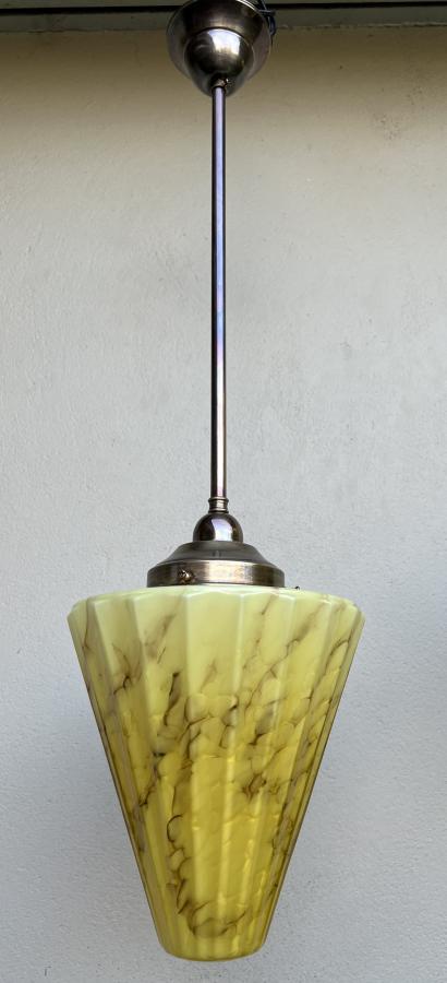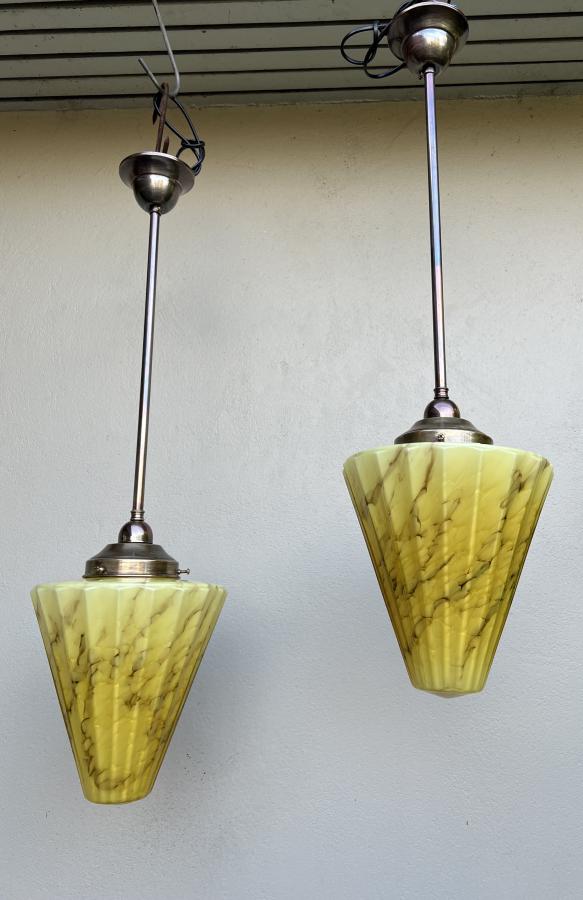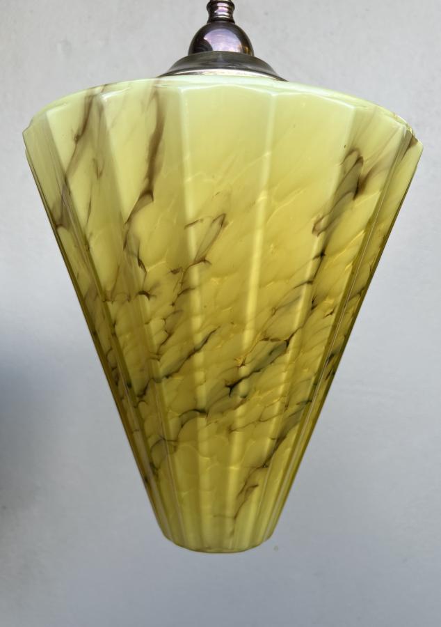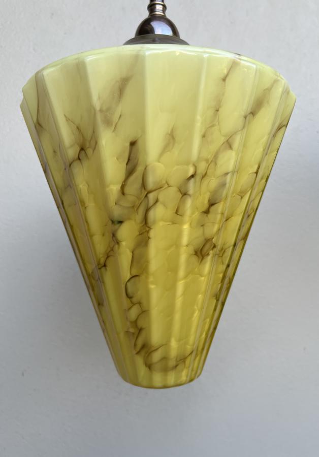 An exceptional pair of large 1930's Czech Deco yellow ribbed glass cone shades with brown veining!