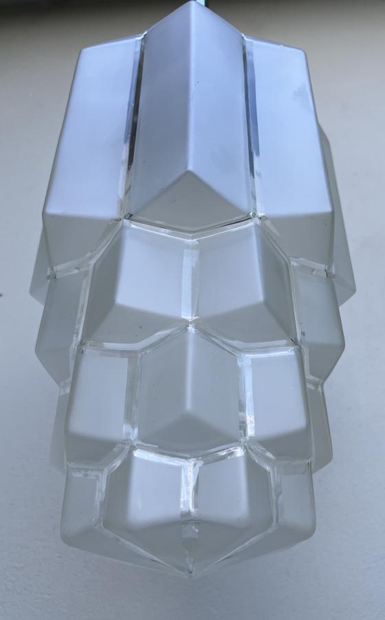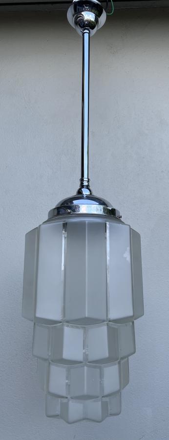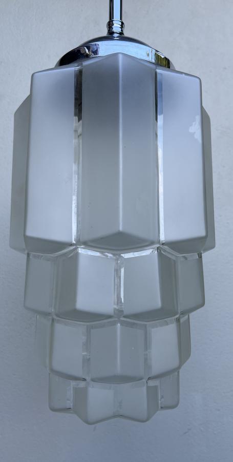 A large 1930's American Deco moulded clear/frosted glass skyscraper shade.