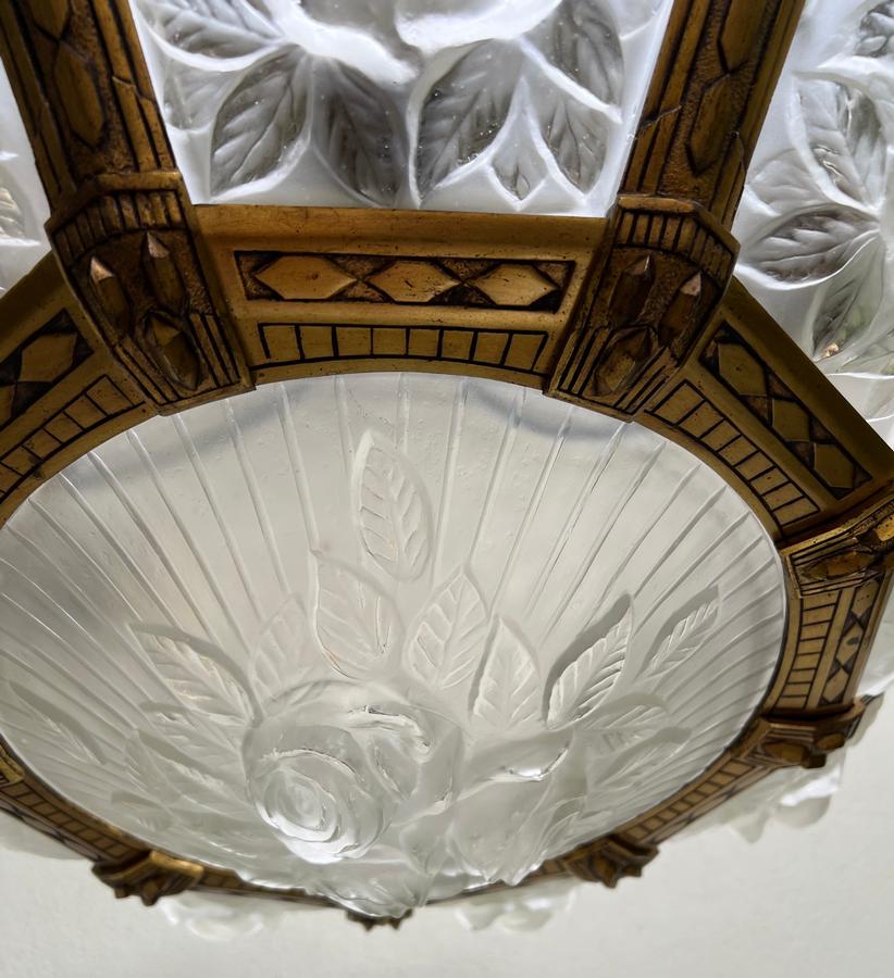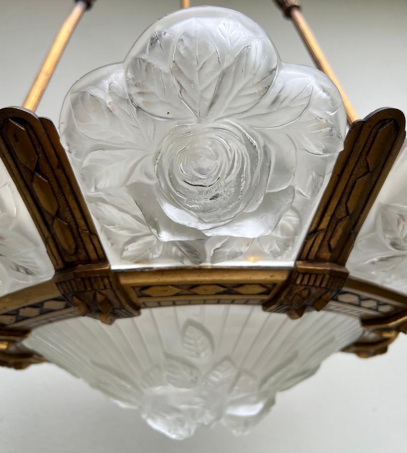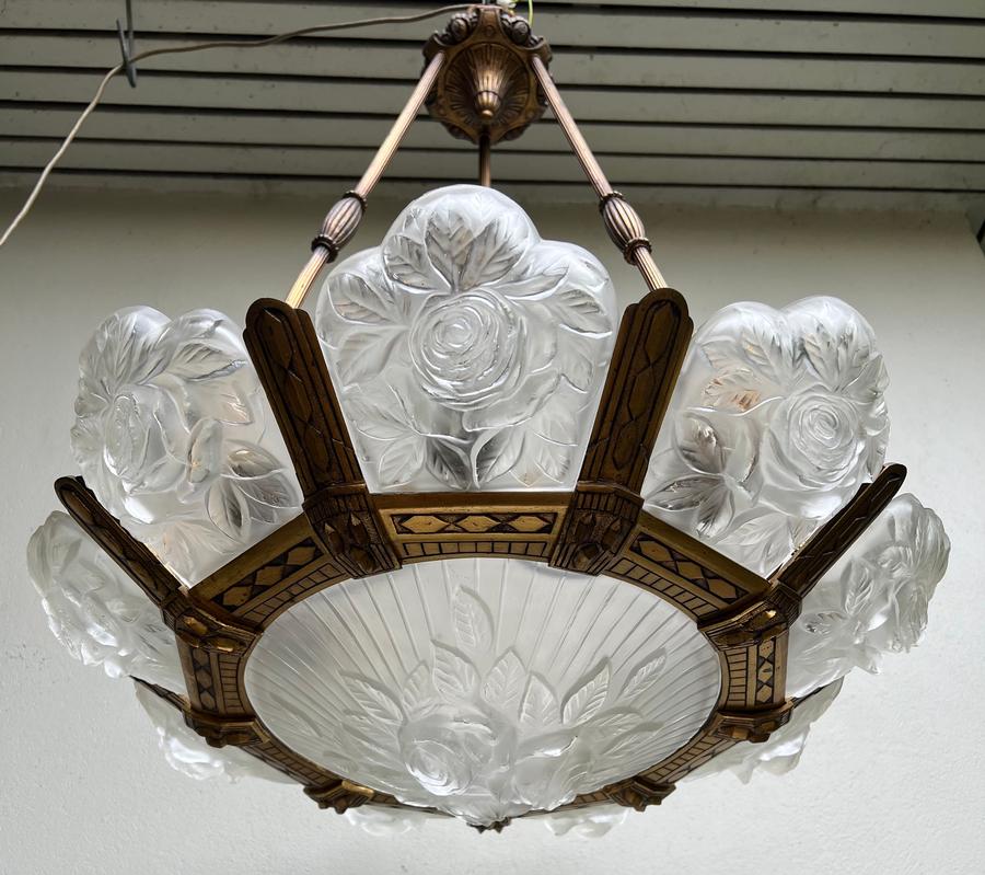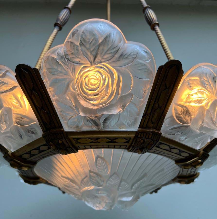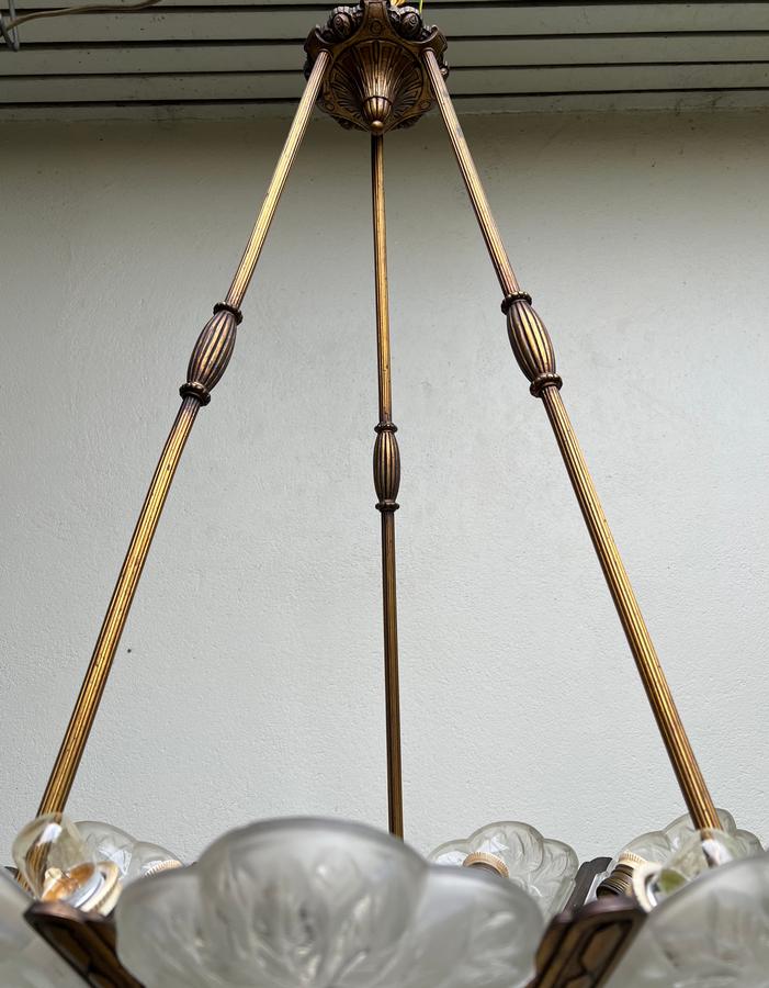 A superb large 1930's French Deco solid bronze 10 light chandelier with clear/frosted press moulded glass shades with a floral/foliage design.