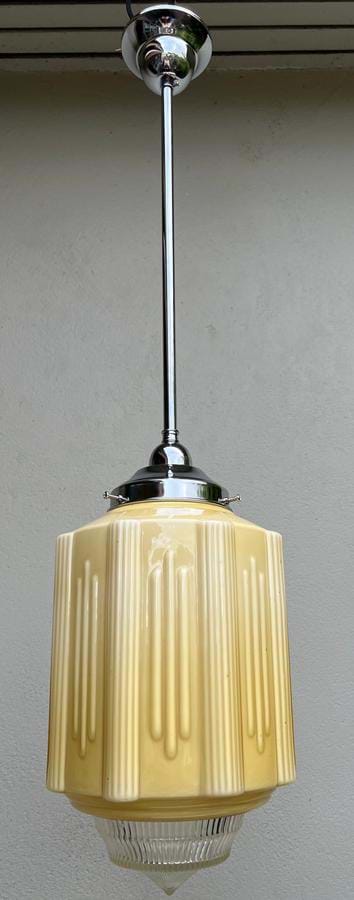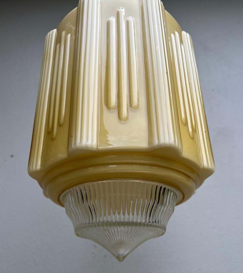 A classic matching pair of 1930's Deco cream moulded glass ceiling light shades with clear (removable) prismatic glass bases.