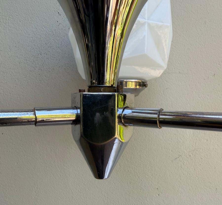 A fine 1930's English Deco/Modernist chromed brass 3 light chandelier with original white angular glass shades.