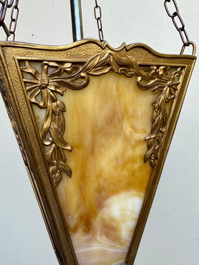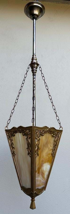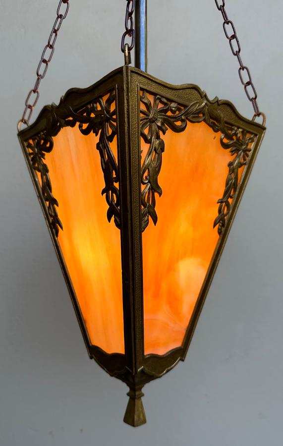 A very nice 1920's/30's English Deco solid cast brass 4 sided lantern with its original slag glass panes.