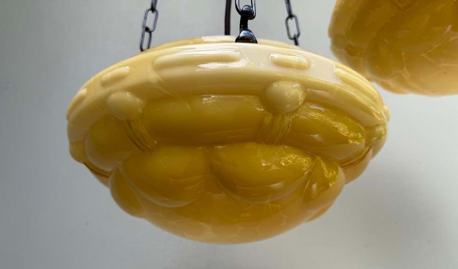 A great pair of 1930's Deco moulded cream/yellow glass ceiling light shades.