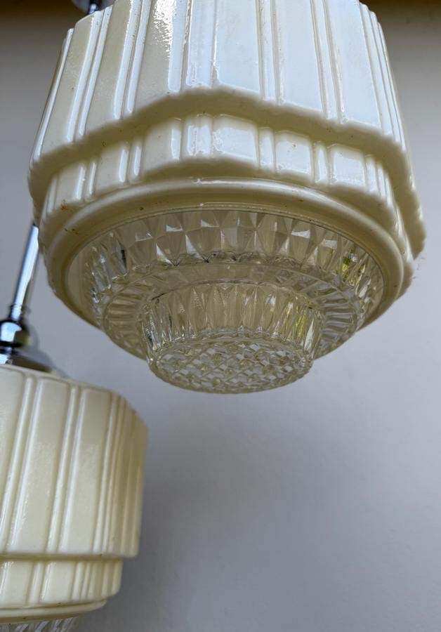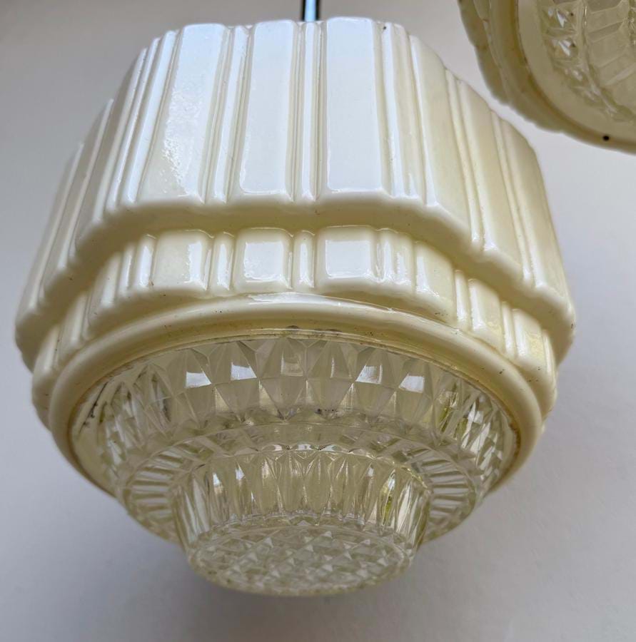A nice pair of 1930's angular ribbed pale cream glass shades with (removable) clear prismatic glass bases.