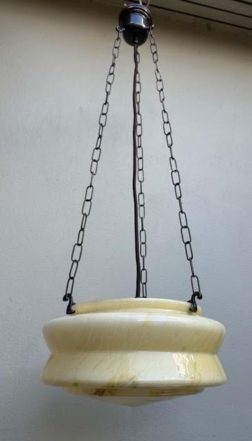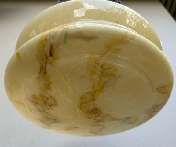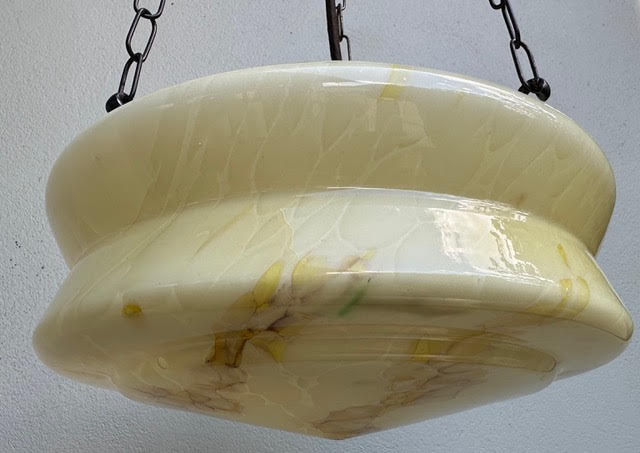 A 1930's Deco moulded cream glass light shade with brown/green veining.
