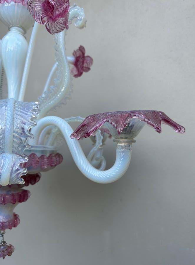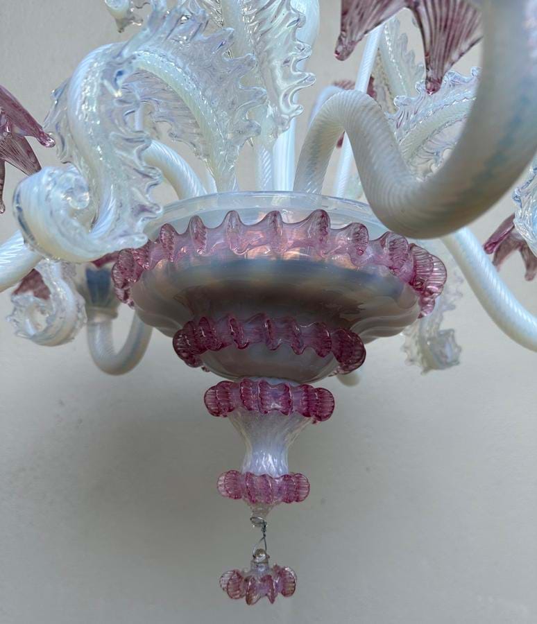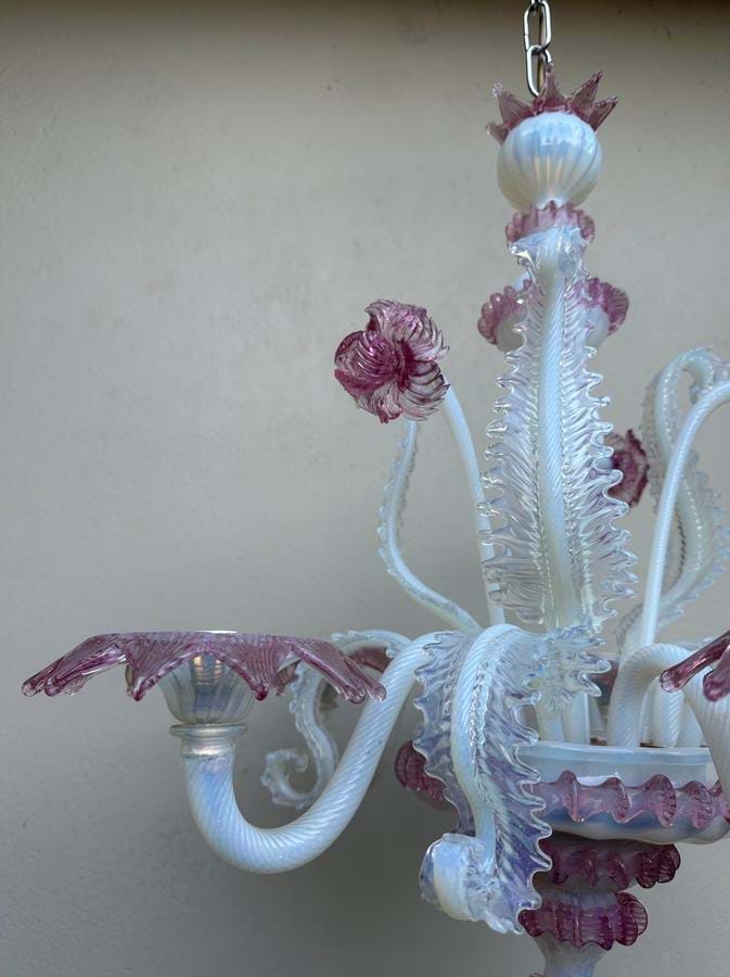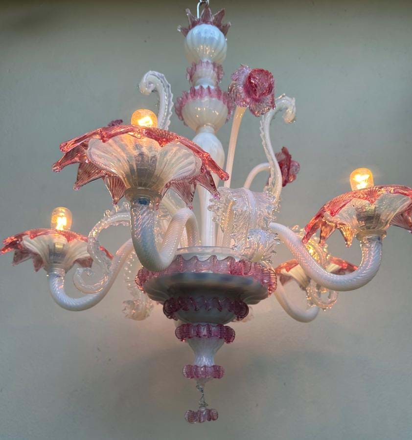 Quite beautiful 1950's Italian Murano hand blown pink and opalescent glass 5 light chandelier.
