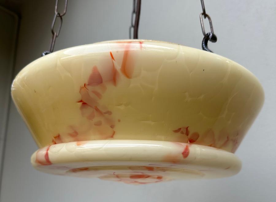 A very attractive 1930's Czech Deco moulded cream glass ceiling light shade with red veining.