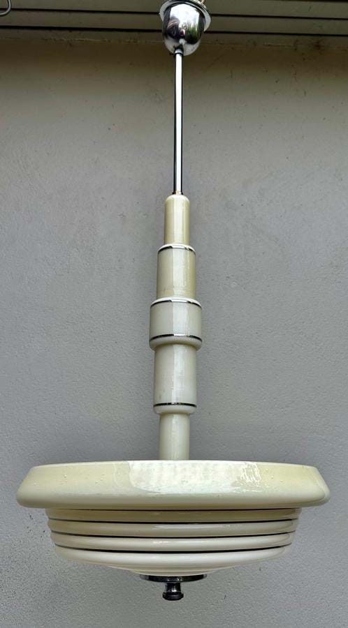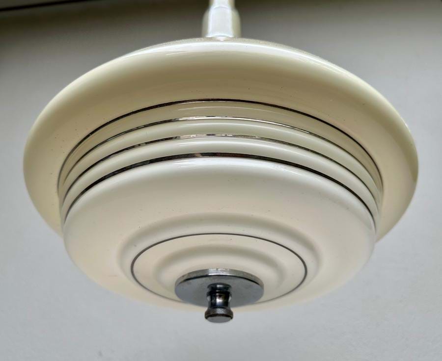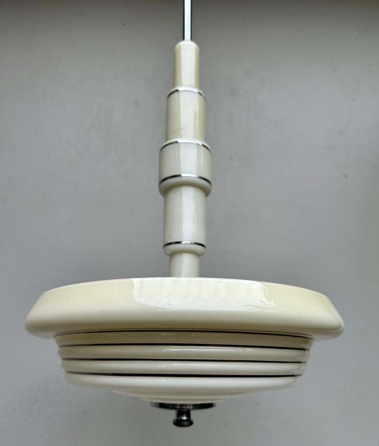 Quite superb 1930's English Deco/Modernist chrome and cream glass pendant light.