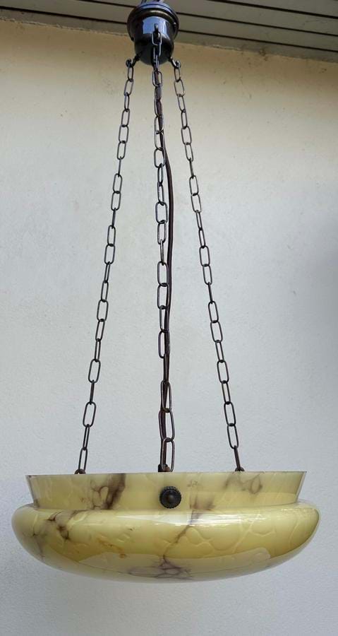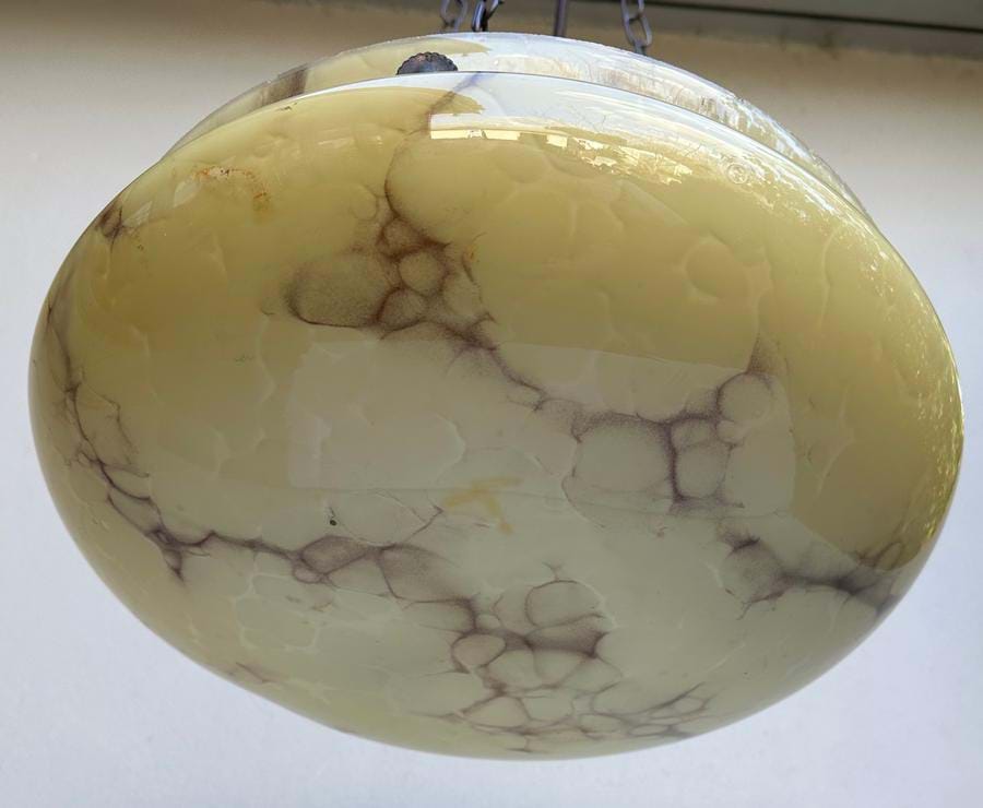 An impressive large 1930's Czech Deco yellow glass ceiling light shade with brown veining.