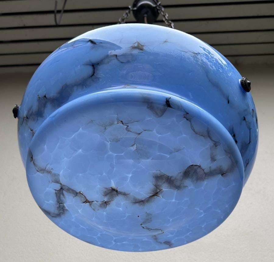 Quite a beautiful large 1930's Czech Deco moulded blue marbled glass ceiling light shade with black veining.