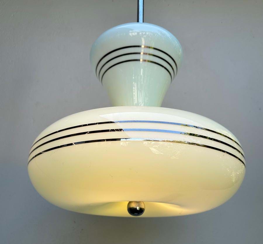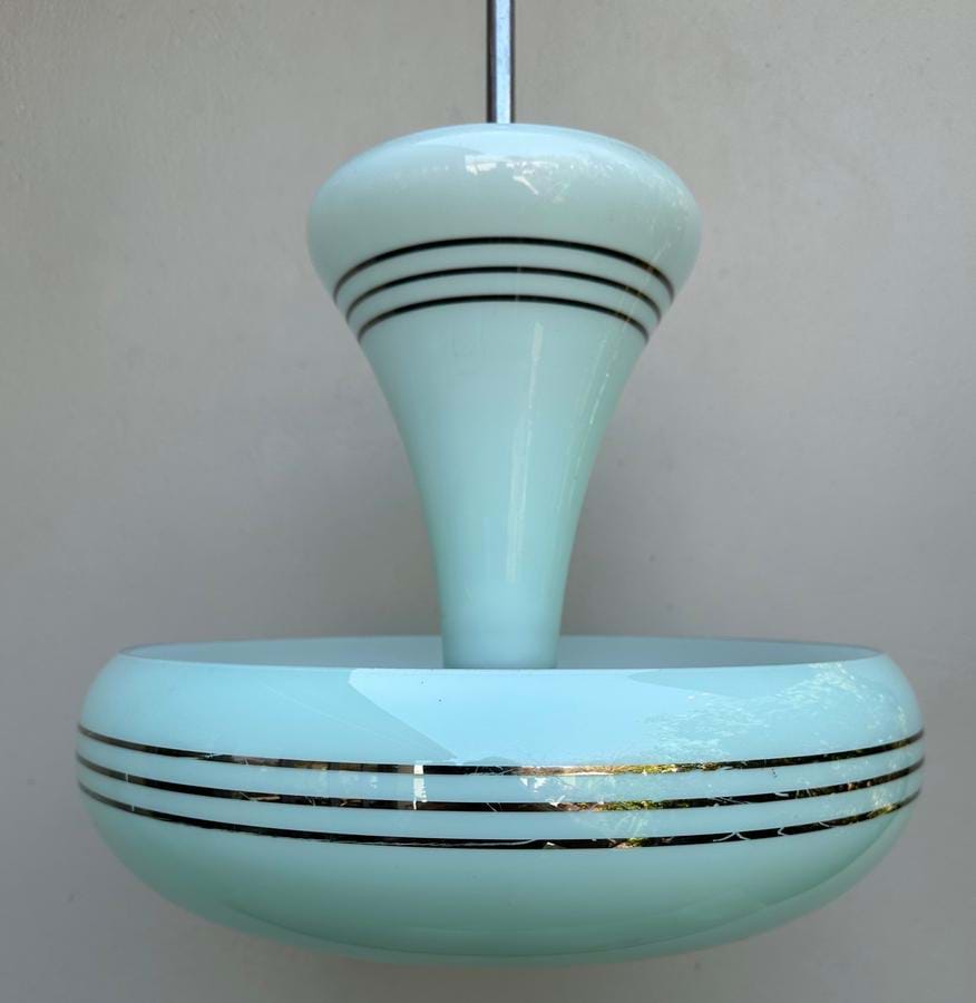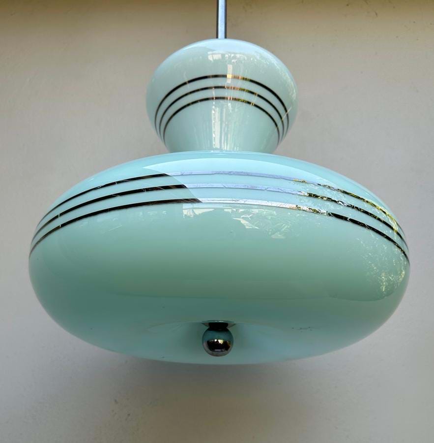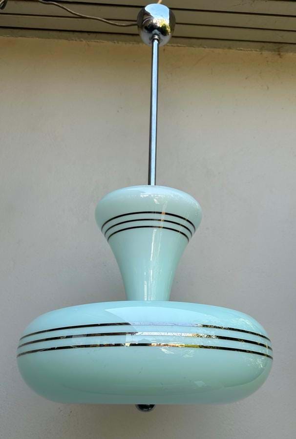 A beautiful large 1930's English Deco blue glass pendant light with chrome detailing and chrome rod suspension.