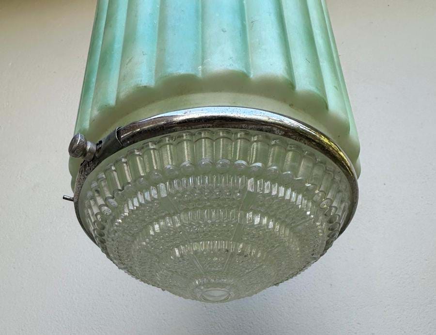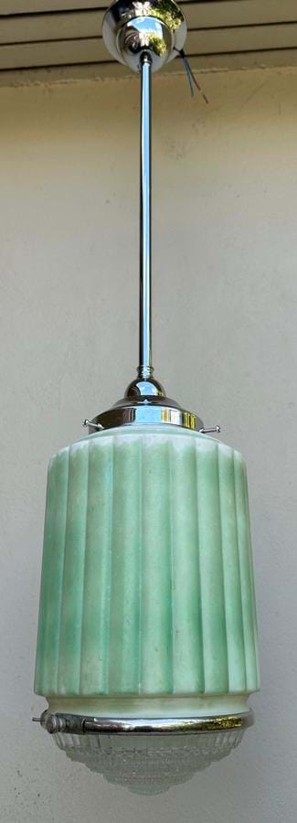 A 1930's Deco green/white ribbed glass shade with clear prismatic glass base (held in place with a chrome ring).