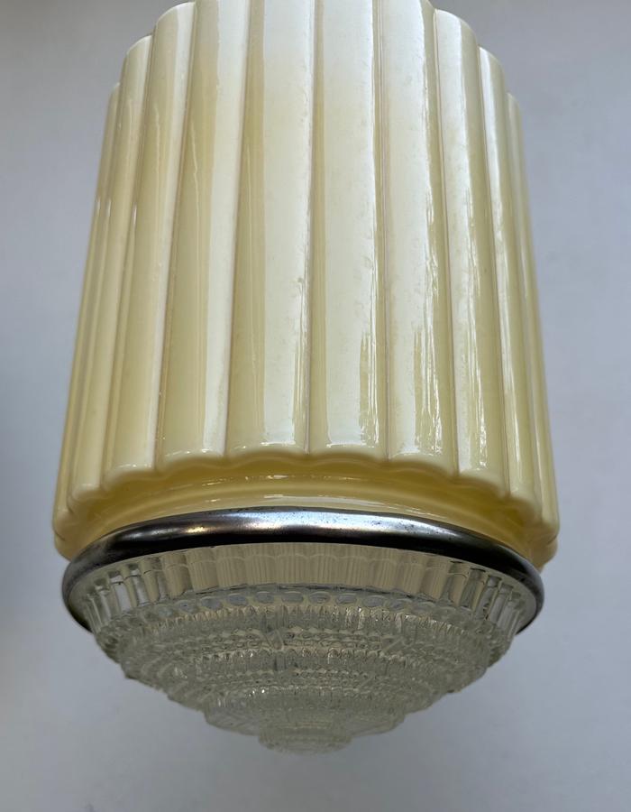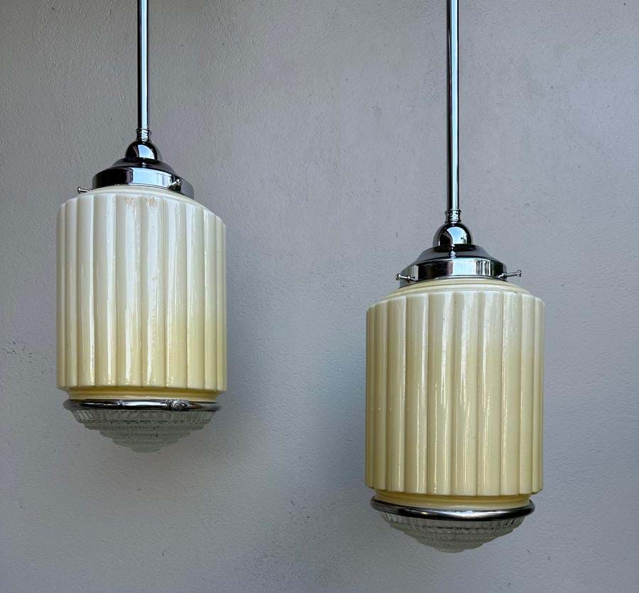 A great set of 1930's Deco cream ribbed glass shades with clear prismatic glass bases (held in place with a removable chrome ring).