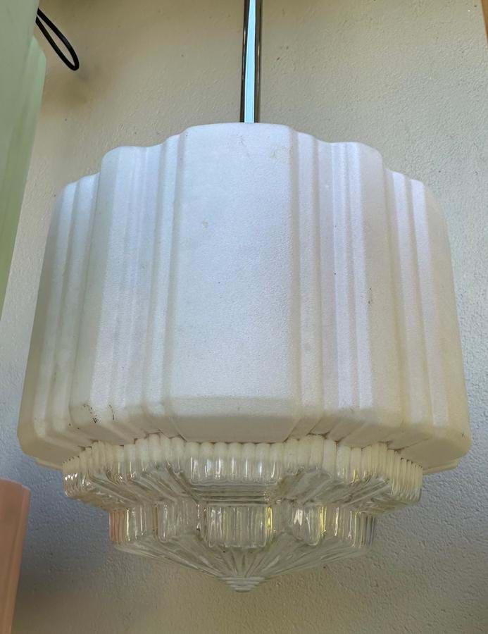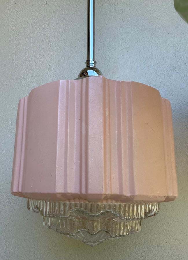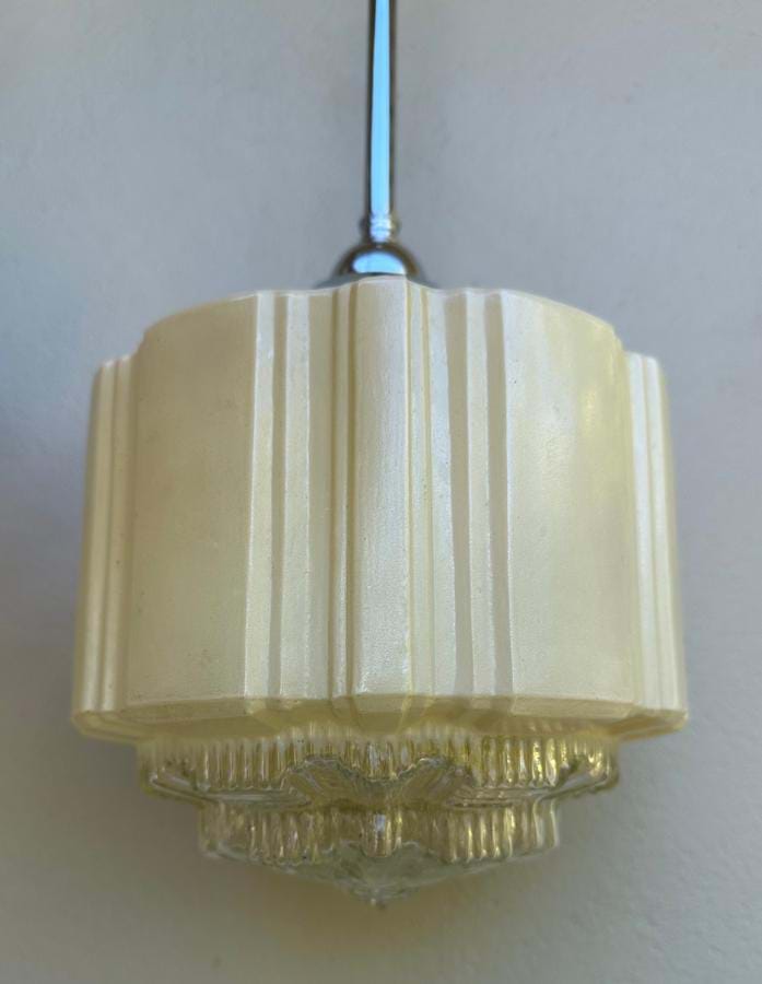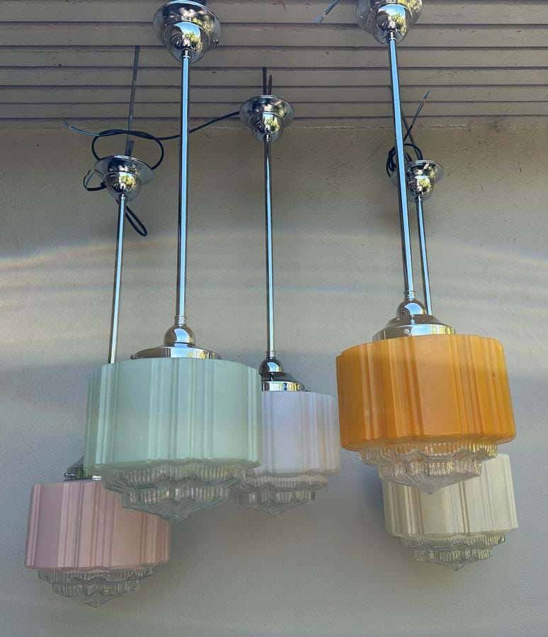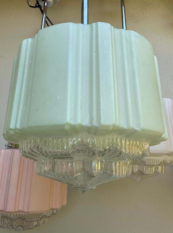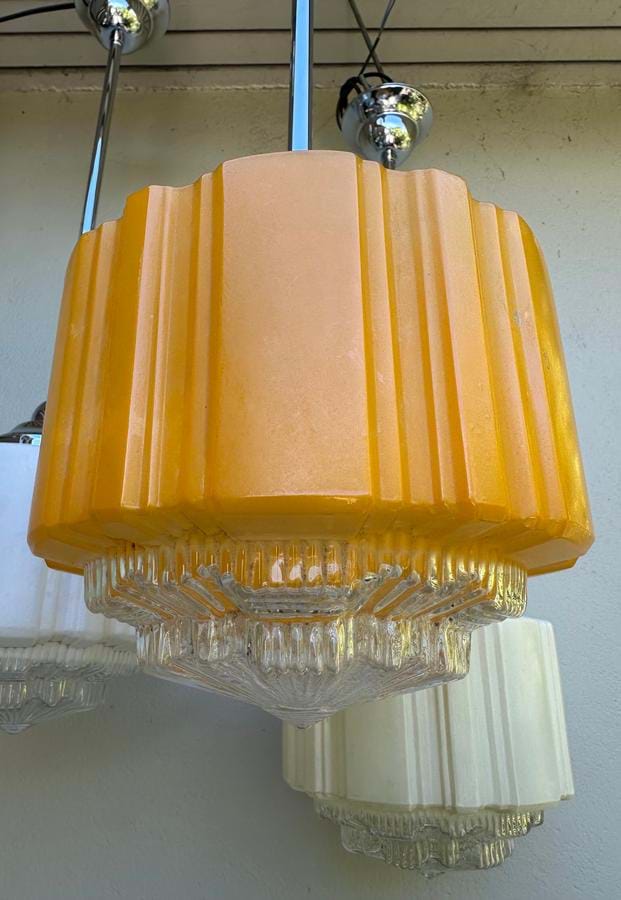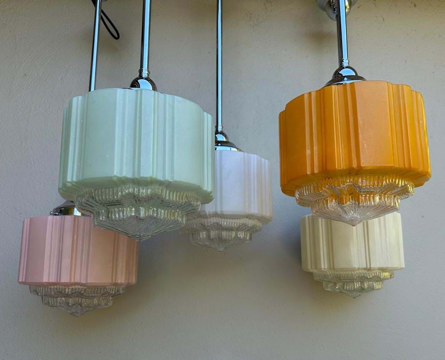 An original 1930's/40's Deco glass 'jeilymould' skyscraper shades with clear bases.