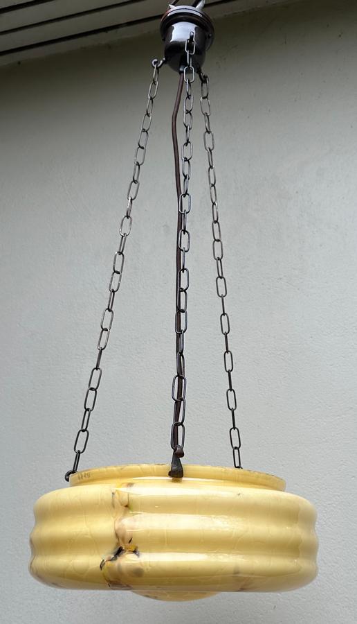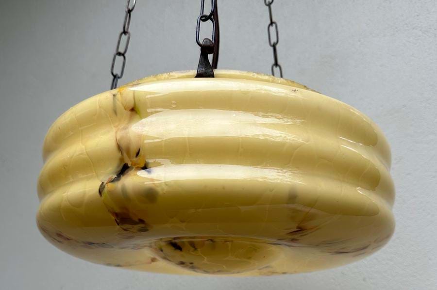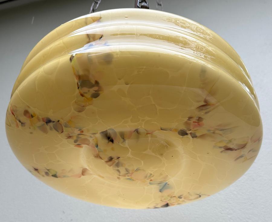 A beautiful large 1930's Deco moulded yellow glass ceiling light shade with brown/blue/red veining.