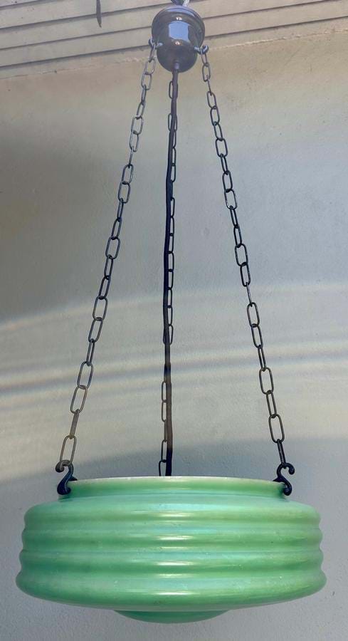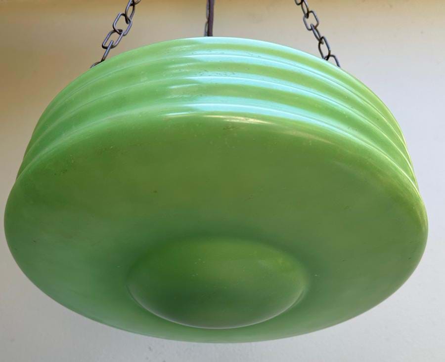 A large 1930's Deco moulded/ribbed green cased (white inside) glass ceiling light shade.