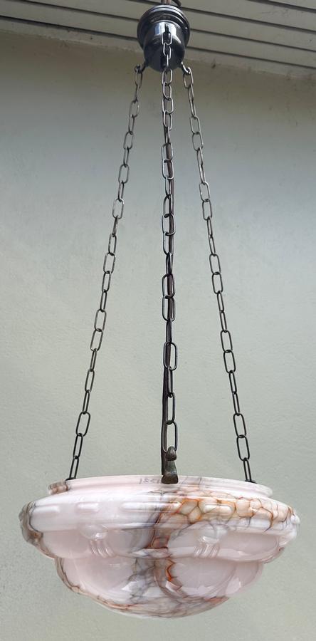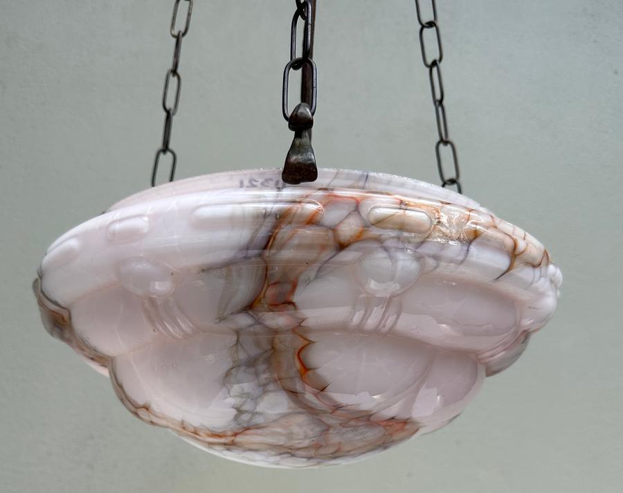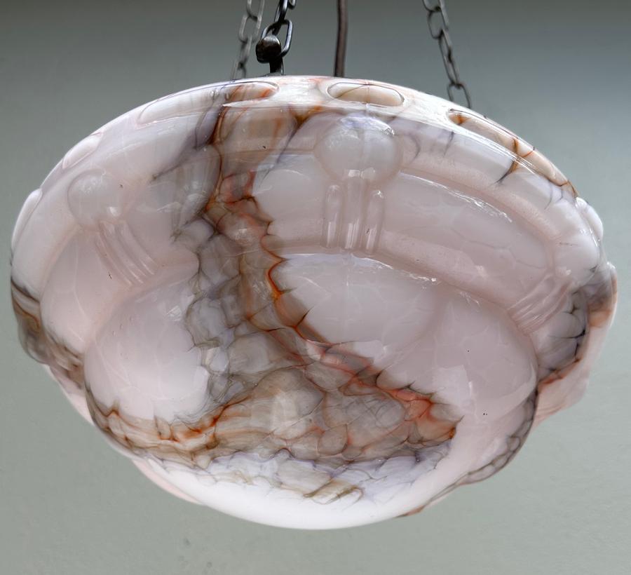A beautiful 1930's Deco moulded pink glass ceiling light shade with purple/orange veining.