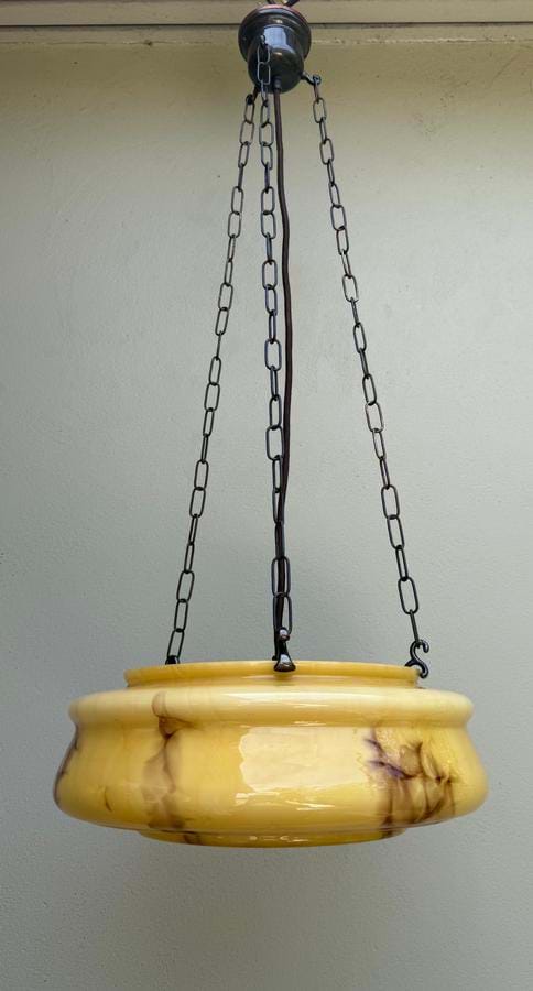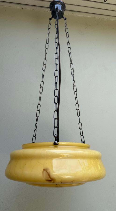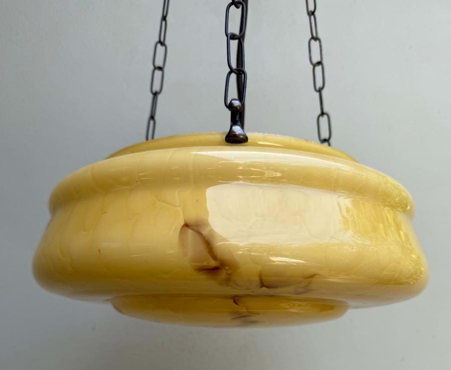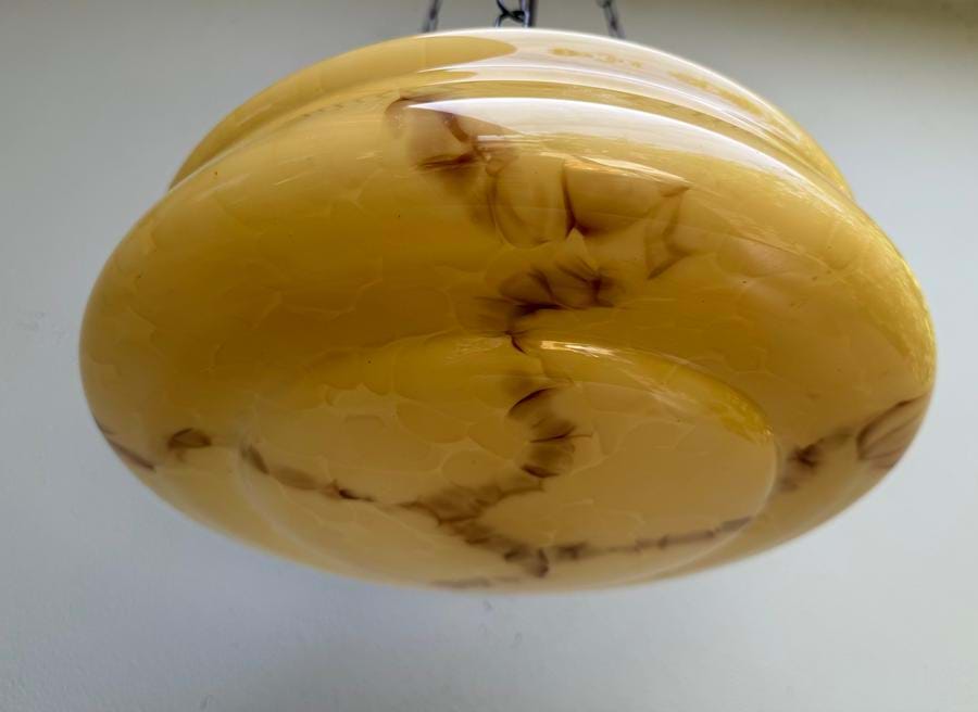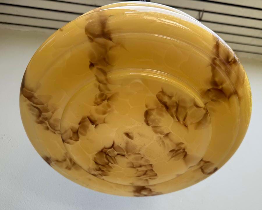 A great pair of large 1930's Czech Deco moulded yellow/cream glass ceiling light shades with brown veining.