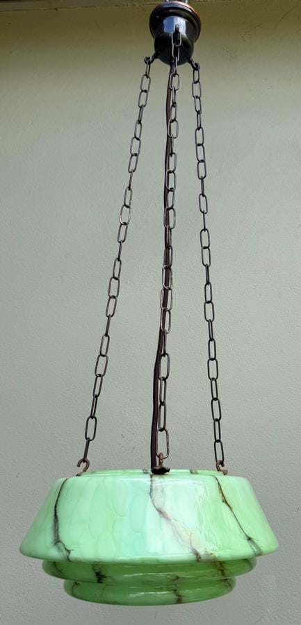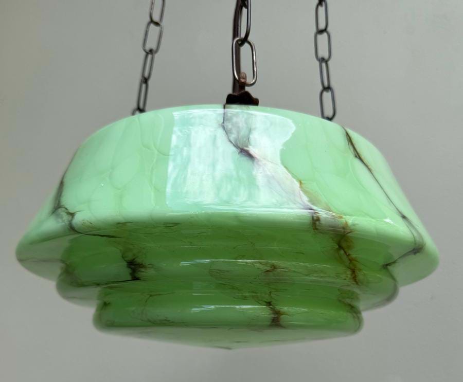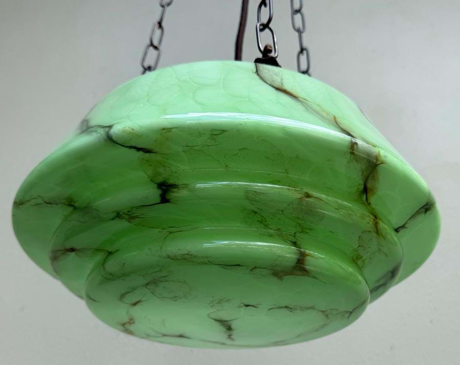 A really attractive 1930's Deco moulded/stepped green glass ceiling light shade with black/brown veining.