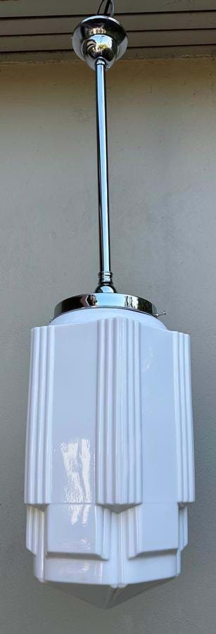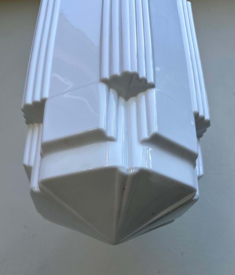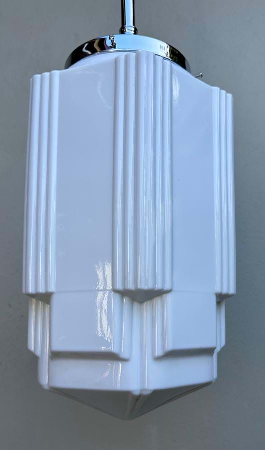 A great pair of large 1930's American Deco white moulded glass skyscraper shades ....great design and size!