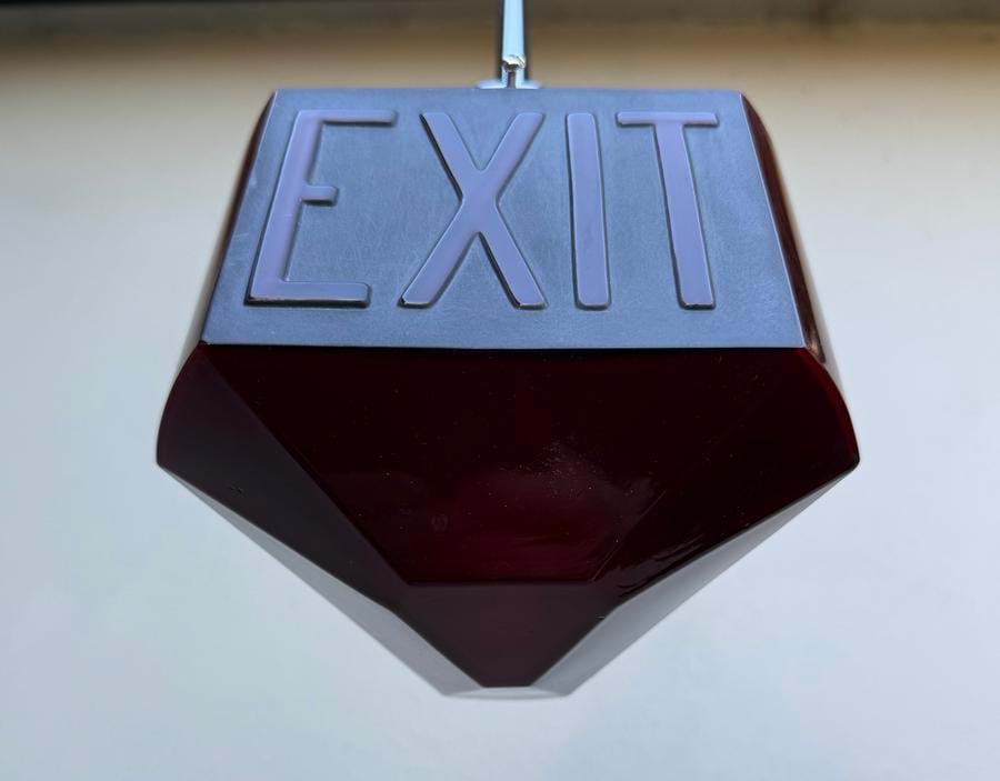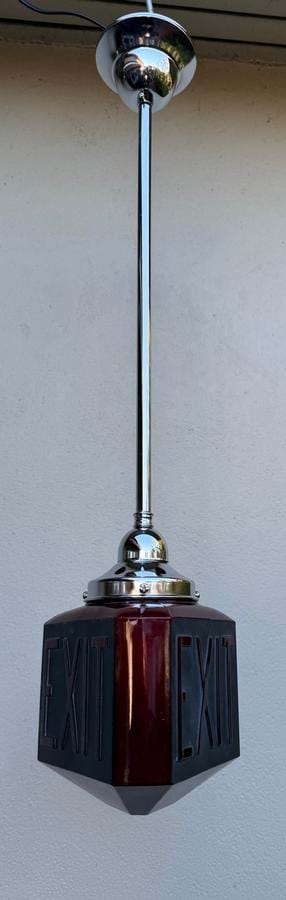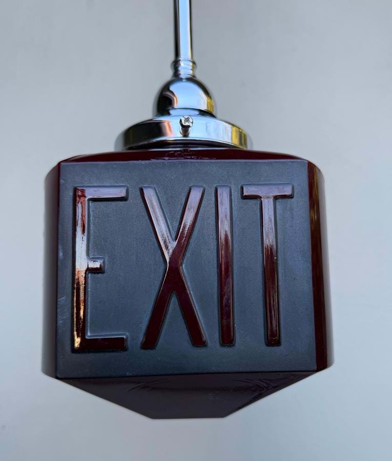 A rare 1930's American Deco triangular ruby glass Exit shade with raised lettering on black background on 3 sides.